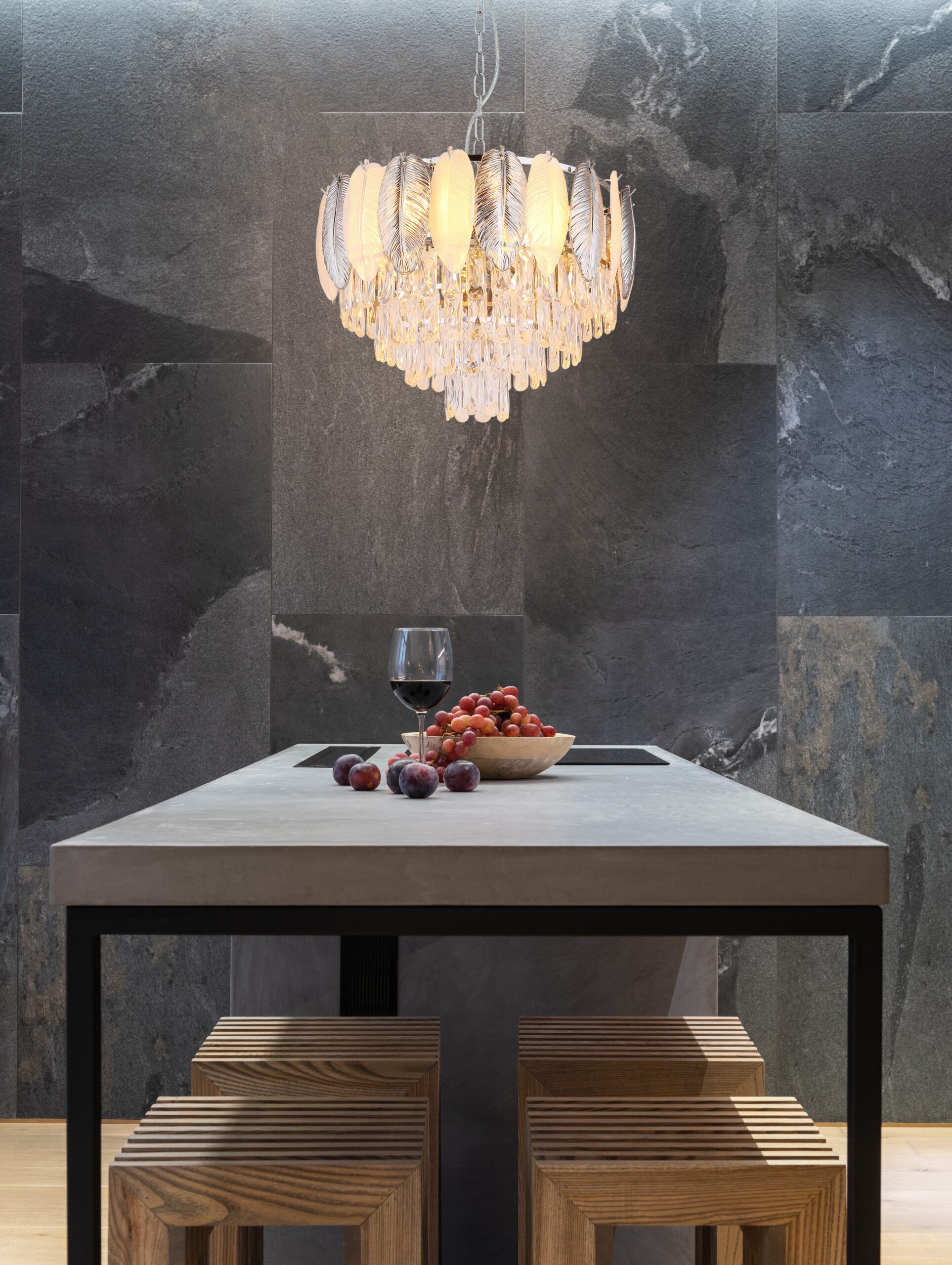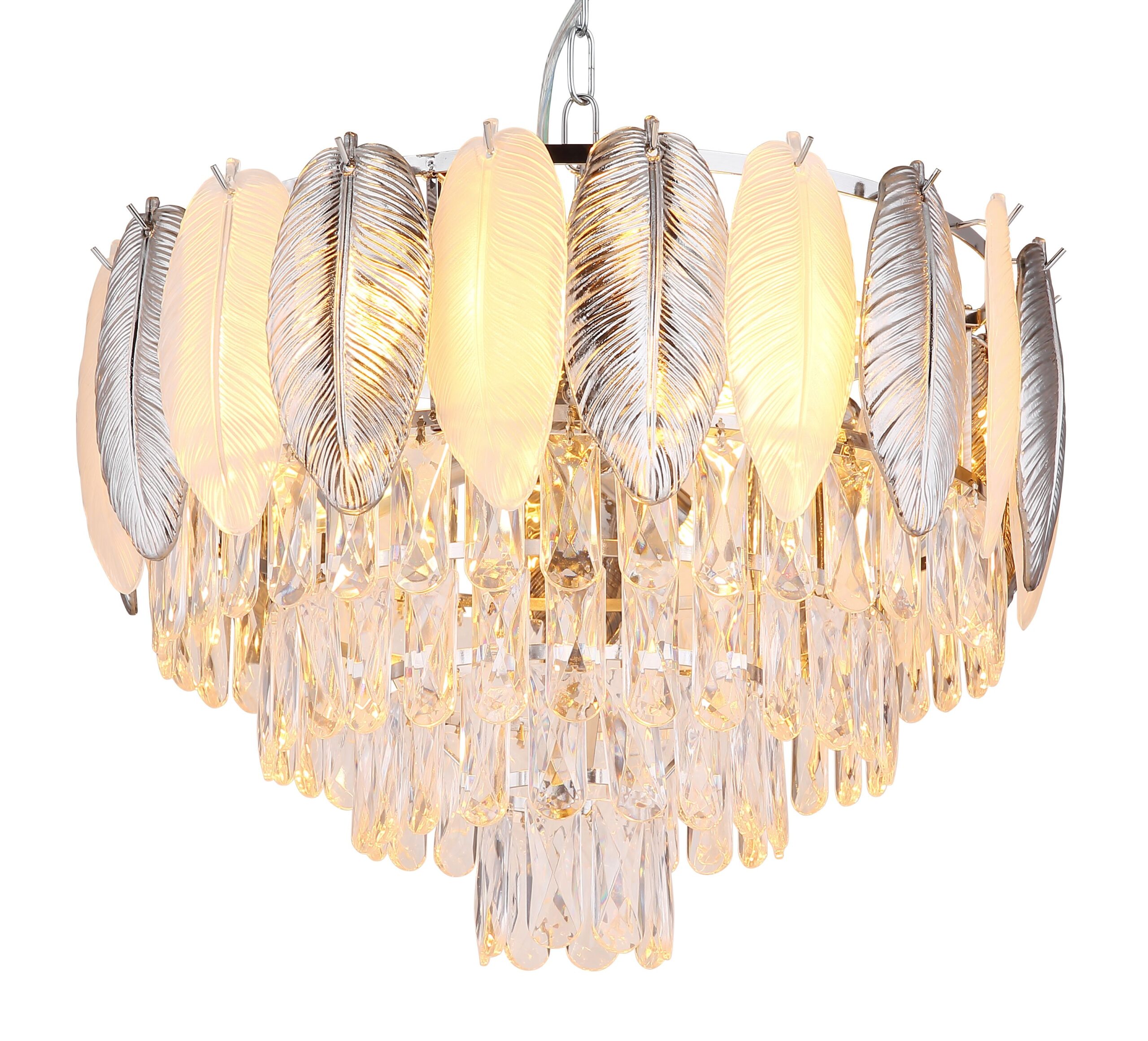 La lámpara de araña Dalton en cromo es una impresionante lámpara tradicional que atrae de inmediato la atención con su diseño redondo y sus elegantes decoraciones de cristales y hojas. El cuerpo de la lámpara está fabricado en metal de alta calidad con un acabado en cromo brillante. La pantalla está adornada con cristales acrílicos transparentes, complementados con elementos acrílicos de color ahumado que tienen un aspecto satinado. Esta cuidadosa combinación de materiales y colores crea una atmósfera única y una luz especial en su espacio.
