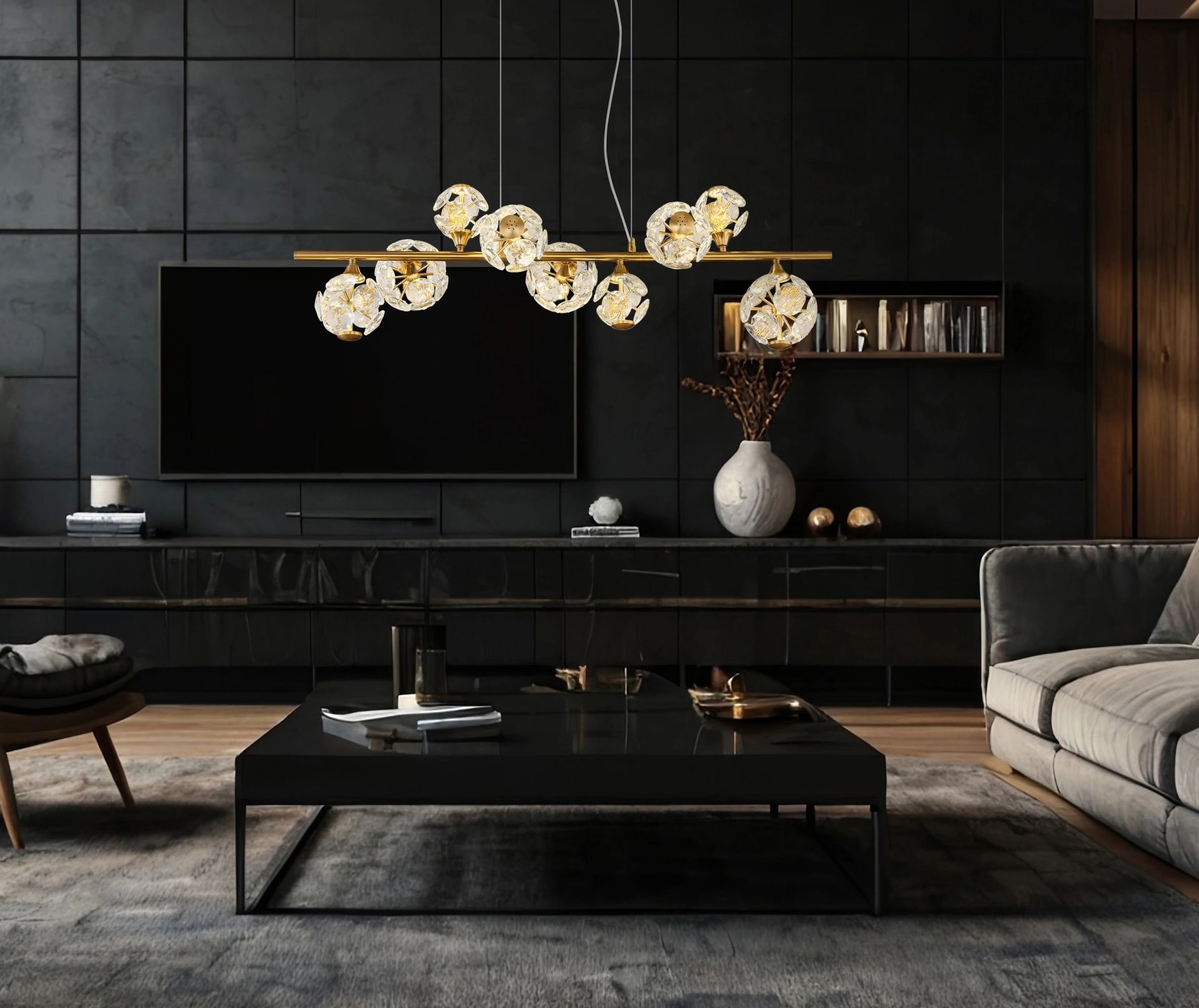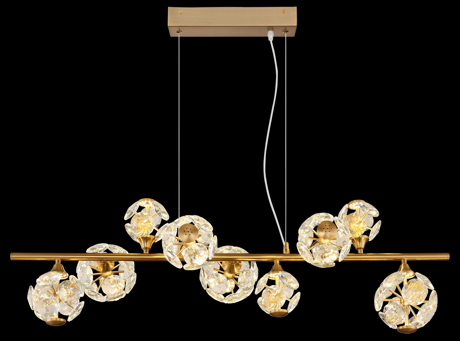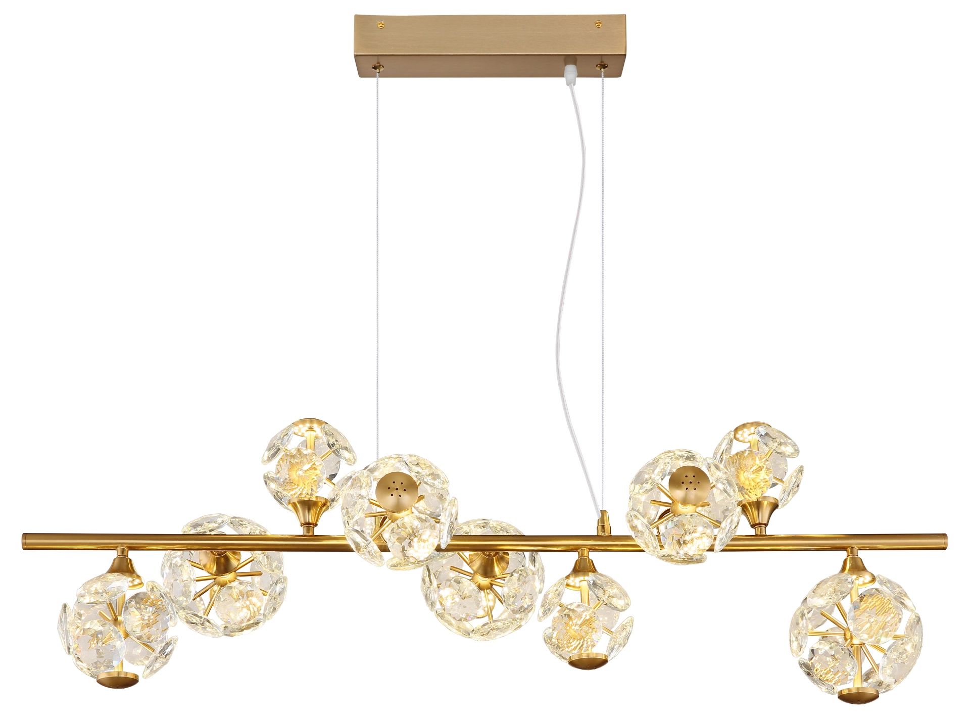 La lámpara colgante VIRINA es una magnífica mezcla de diseño elegante y materiales de lujo, perfecta para cualquier espacio. La barra recta en metal dorado sostiene diversas esferas, decoradas con brillantes cristales K9 que reflejan la luz de manera impresionante. Con unas dimensiones de 1010 mm de largo y 345 mm de ancho, esta lámpara es extremadamente adecuada para espacios más grandes como salas de estar, comedores y pasillos. Gracias a la tecnología LED integrada, la lámpara ofrece una excelente salida de lúmenes de 7136 lúmenes y emite un color de luz agradable de 3000 K, lo que proporciona una atmósfera cálida y acogedora.