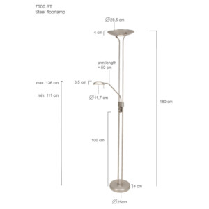 Una lámpara de pie que, gracias a su brazo de lectura, es una excelente opción para leer, creando además un ambiente agradable con la luz hacia arriba. Esta moderna lámpara de lectura Mexlite Jens está fabricada en acero cepillado y equipada con 2 módulos LED de bajo consumo. Esta lámpara de lectura cuenta con un uplighter y un brazo de lectura, ambos regulables por separado a través de los dos atenuadores giratorios en el accesorio.