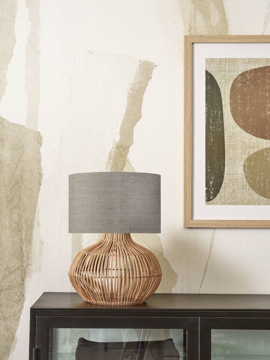 Lámpara de mesa bohemia de ratán y lino gris GOOD & MOJO Kalahari