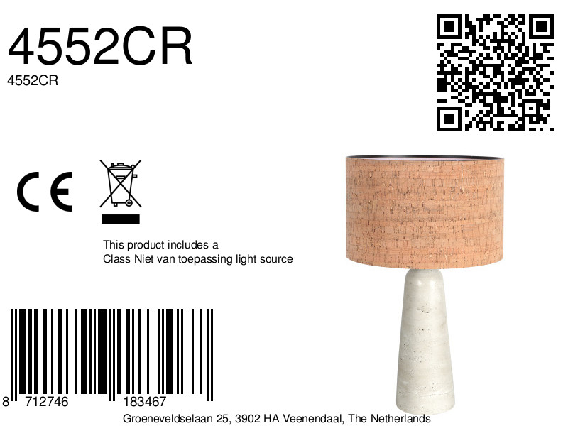 La Travino 4552CR es una lujosa lámpara de mesa con una apariencia natural. La pantalla redonda de corcho de 30 cm de diámetro proporciona una distribución de luz cálida y le da a la lámpara un carácter relajante. La base de travertino forma una pieza de base sólida y elegante con matices de color y vetas únicas, lo que hace que cada ejemplar tenga una apariencia exclusiva. Con una altura total de 49 cm, esta lámpara es ideal para mesitas de noche más grandes, consolas o cómodas.