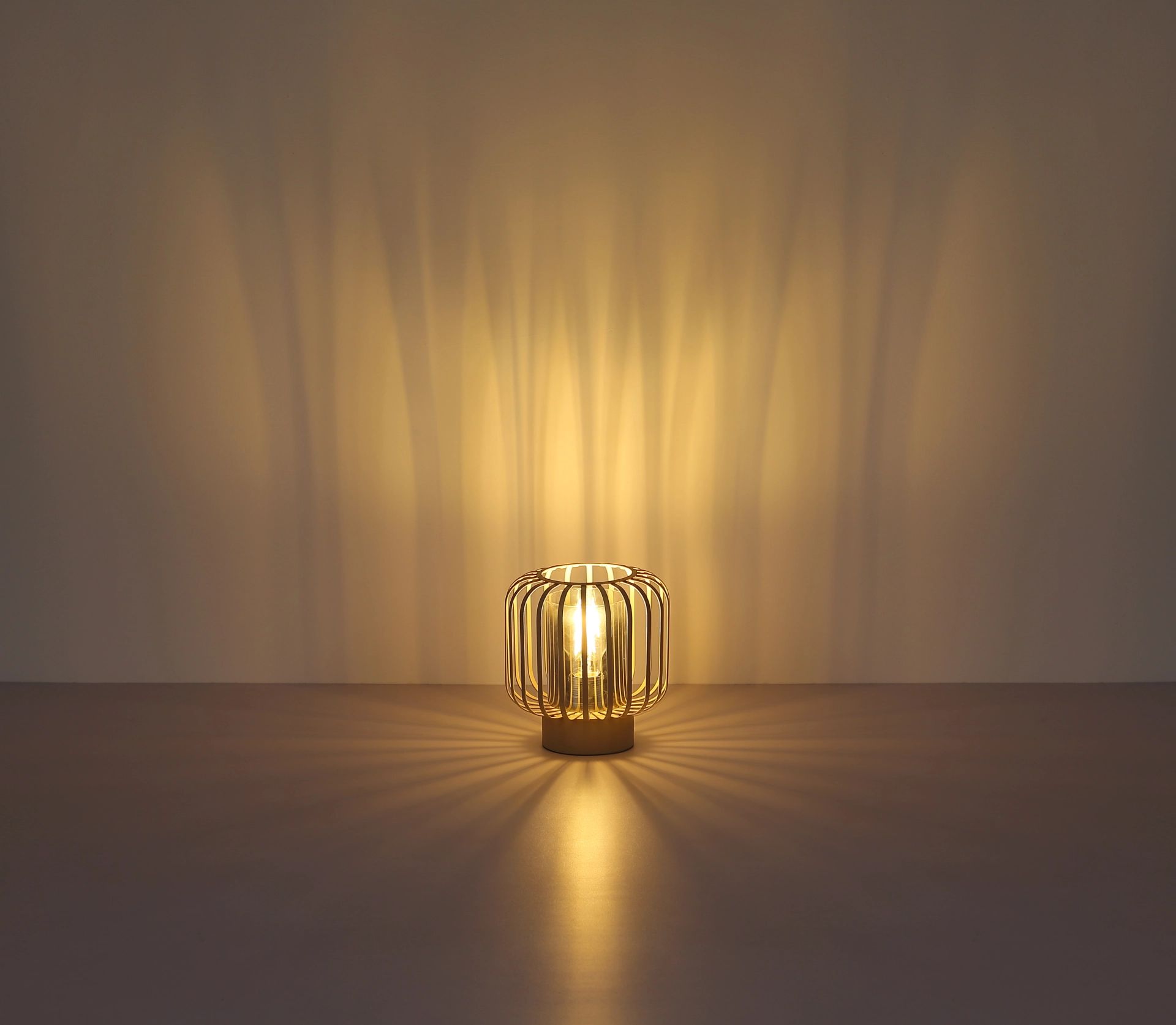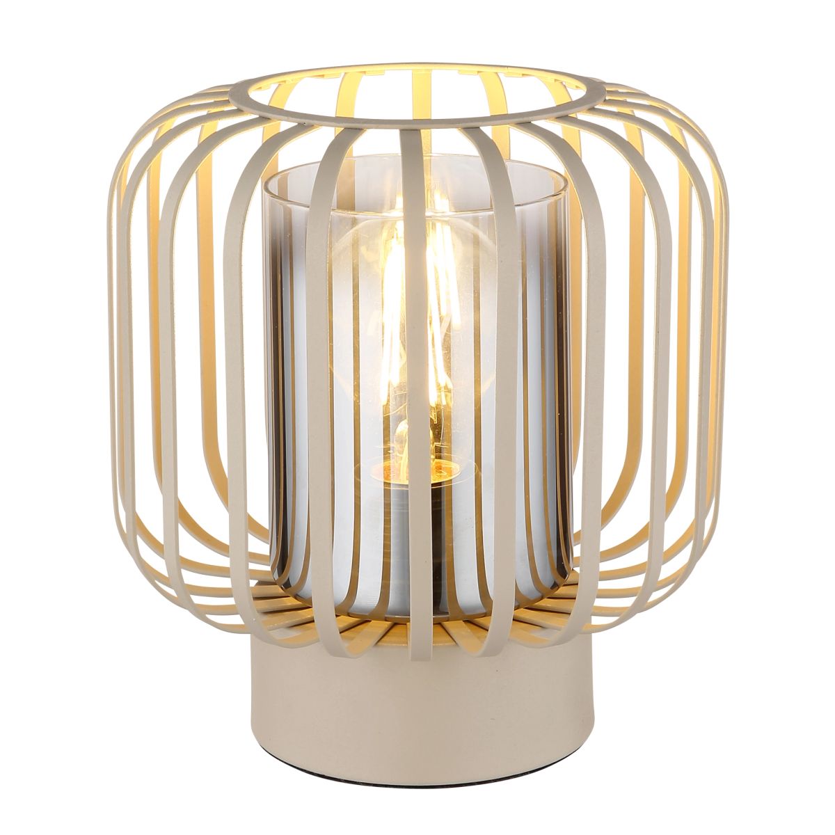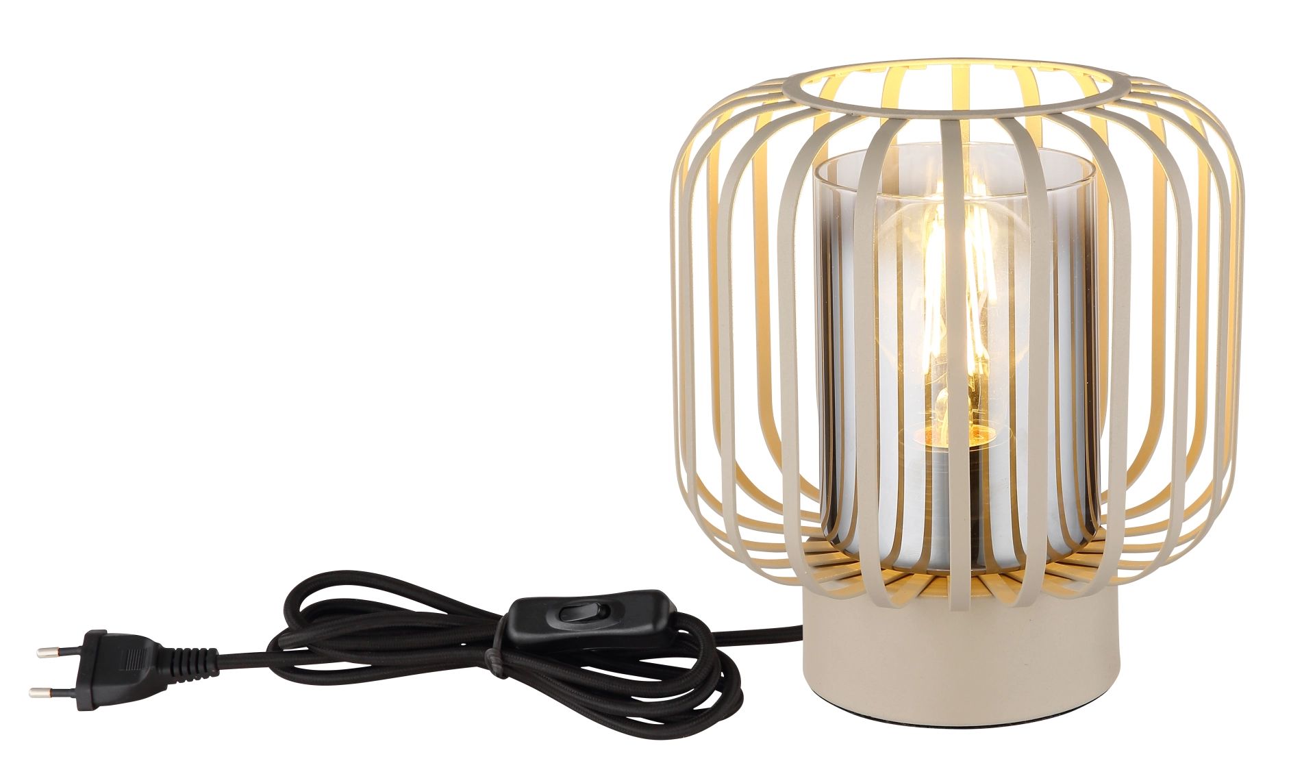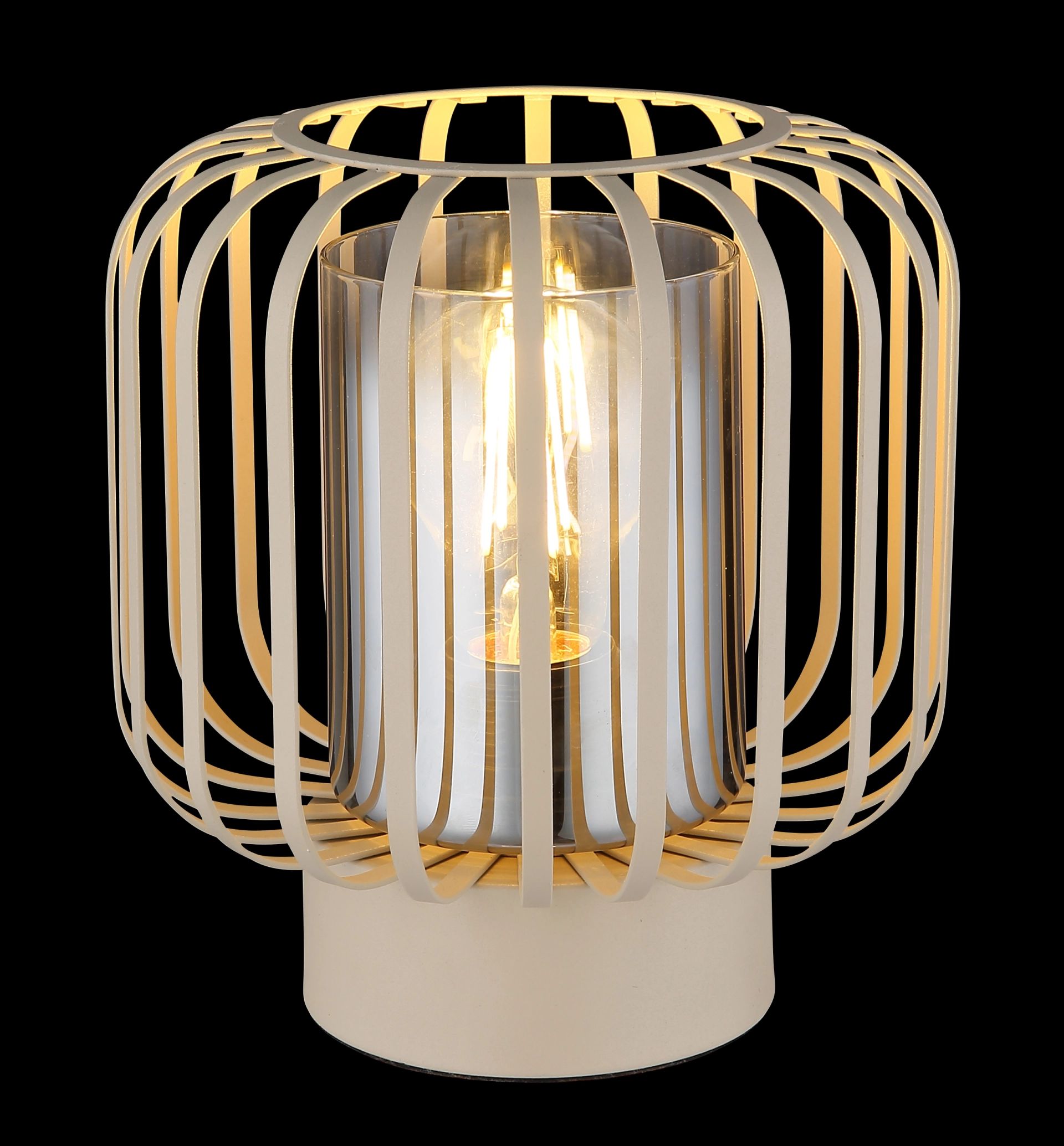 La lámpara de mesa ALFRED tiene un diseño llamativo y elegante que enriquece su interior. Con su combinación de colores armoniosa y la pantalla de luz en forma de bola de metal en color arena, mate, la lámpara crea un ambiente cálido y acogedor. En su interior, hay un cilindro de vidrio que difunde la luz de manera suave y proporciona una iluminación uniforme. La combinación de las varillas metálicas en color arena y el elemento de vidrio ahumado con un diseño claro le da a la lámpara una apariencia elegante, ideal para cualquier espacio.