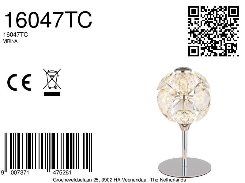 La lámpara de mesa VIRINA forma la combinación ideal de diseño elegante y iluminación práctica. Con una base metálica redonda y cromada y una brillante pantalla de cristal K9, esta lámpara ofrece una apariencia lujosa que eleva cualquier interior a un nivel superior. Con un diámetro de 150 mm, esta lámpara es perfecta para mesas pequeñas, aparadores o mesas de noche. Los cristales K9 brillan con la luz y crean un destello encantador, lo que contribuye a una atmósfera cálida y acogedora.