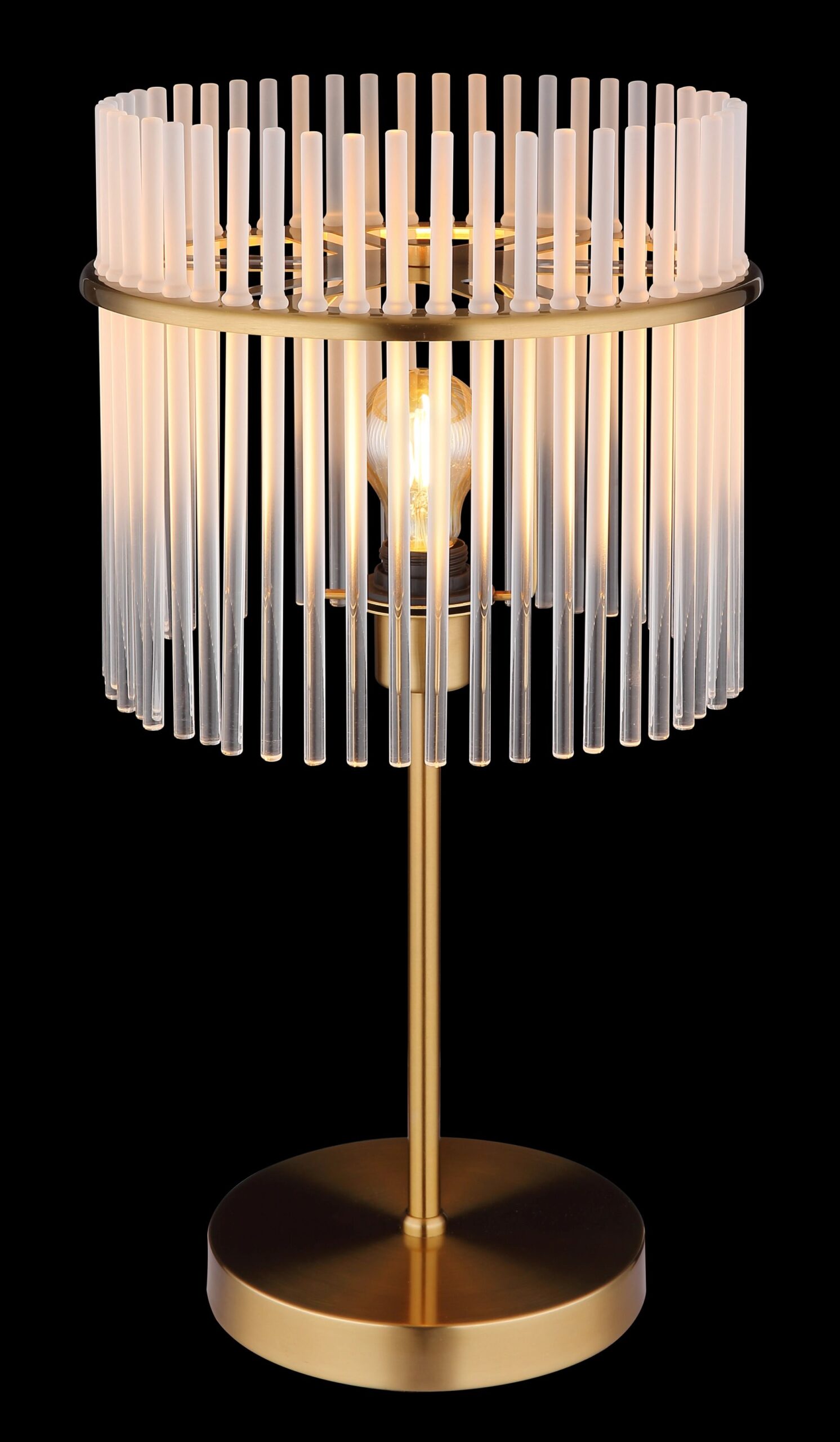 La lámpara de mesa GORLEY es una hermosa combinación de diseño elegante y refinamiento funcional. El cuerpo metálico redondo en un acabado dorado mate soporta una pantalla a juego, fabricada con varillas de vidrio opalino y cristal claro dispuestas artísticamente. Esta disposición única crea un juego de luces atmosférico que genera un ambiente cálido en cualquier espacio. Ya sea que desees iluminar un escritorio, una mesita de noche o una consola, la lámpara de mesa GORLEY es la opción perfecta para salas de estar, dormitorios u oficinas.