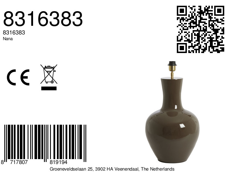 La lámpara de mesa Nana de Light & Living en un elegante marrón oscuro combina tonos cálidos con un aspecto estiloso. Con un diámetro de 33 cm y una altura de 51 cm, este modelo es compacto pero llamativo, perfecto para un aparador o mesita de noche. Su robusto diseño metálico con acabado brillante irradia calidad y se integra sin esfuerzo en interiores tanto modernos como clásicos. La lámpara está equipada con un casquillo E27 y se entrega sin fuente de luz, para que puedas elegir la variante adecuada. El funcionamiento se realiza a través de un interruptor de cable y, dependiendo de la fuente de luz elegida, la lámpara es regulable. Gracias a su clasificación IP20, esta lámpara es adecuada solo para uso en interiores.