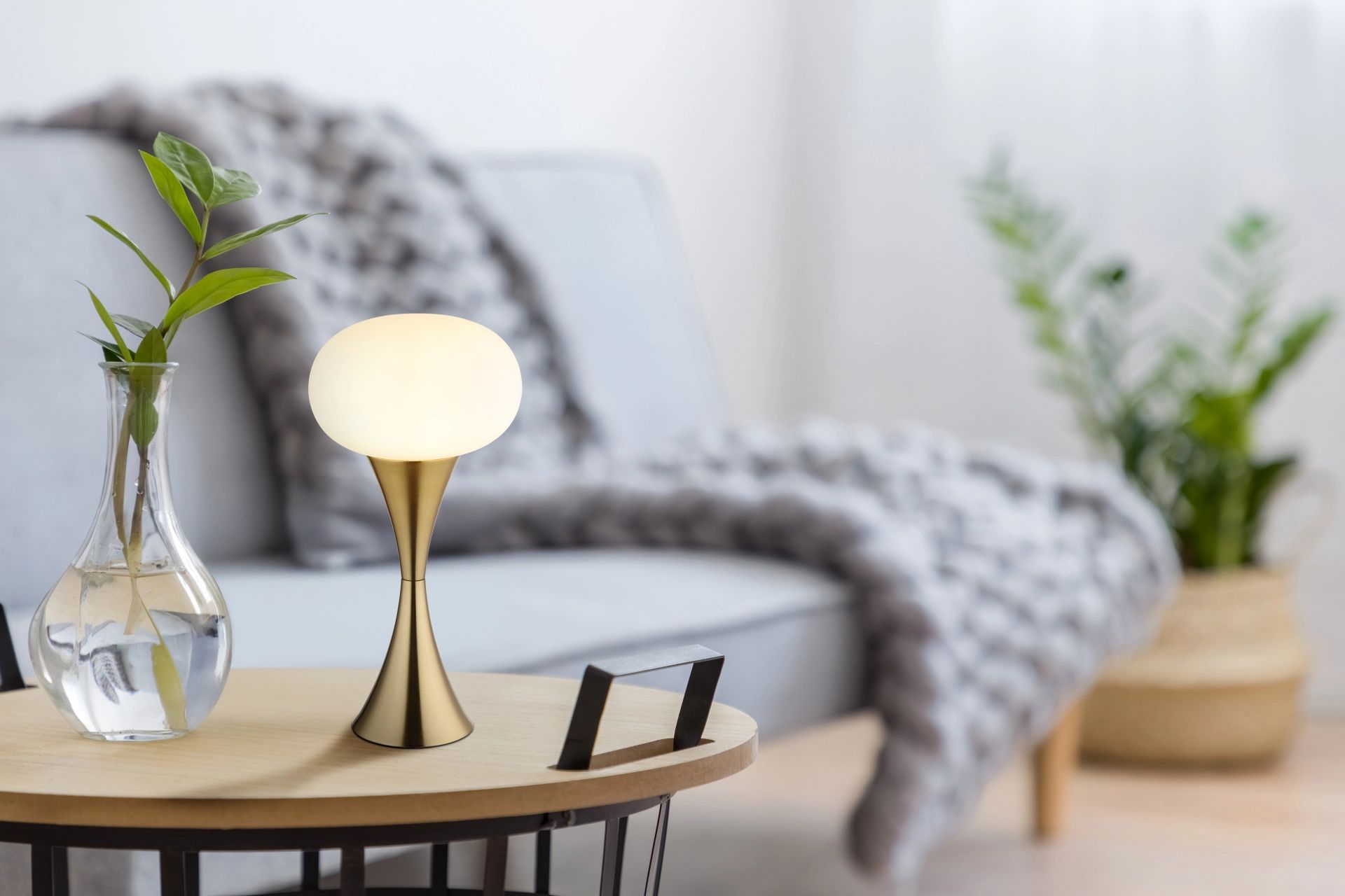La lámpara de mesa RONALD es un acento refinado para cualquier interior, con su elegante forma de copa que atrae inmediatamente la atención. El cuerpo metálico en un estiloso color latón combina a la perfección con la pantalla de vidrio blanco opalino, lo que proporciona una apariencia moderna que se adapta a diversos entornos. La lámpara es fácil de operar gracias al práctico interruptor de palanca en el cable.