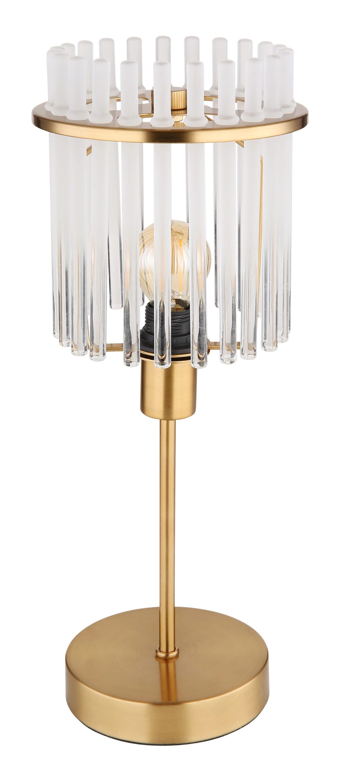La lámpara de mesa GORLEY es una magnífica adquisición para tu interior y crea una atmósfera única en cada habitación. Esta lámpara cuenta con una pantalla redonda, hecha de vidrio opalino y varillas de vidrio claro que forman un hermoso degradado. La luz cálida que emite la lámpara añade un ambiente acogedor. El elegante cuerpo de la lámpara de mesa GORLEY está fabricado en metal mate de color dorado, lo que contribuye a su aspecto estiloso.