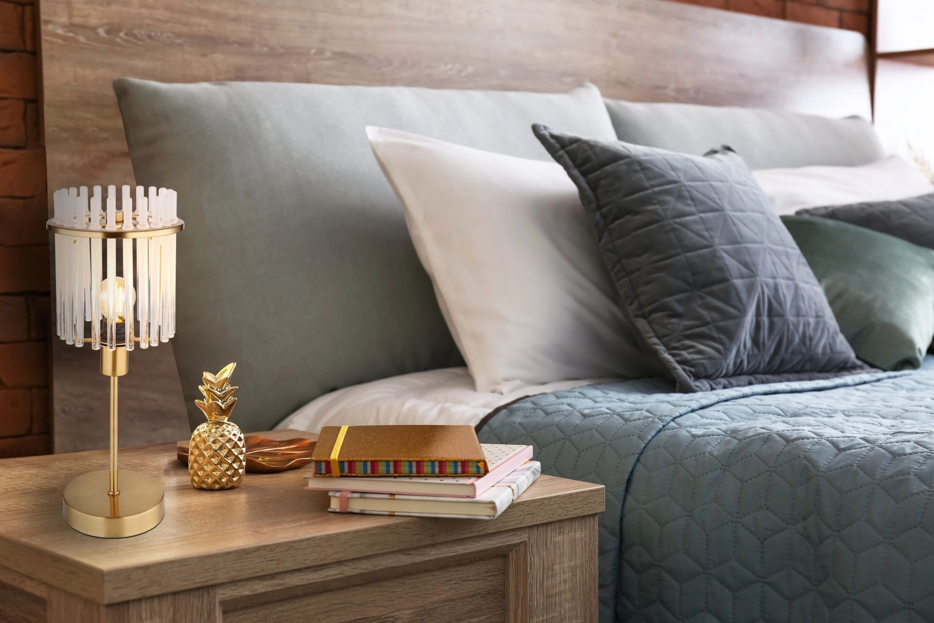Lámpara de mesa moderna con cristal opalino y dorado. Gorley