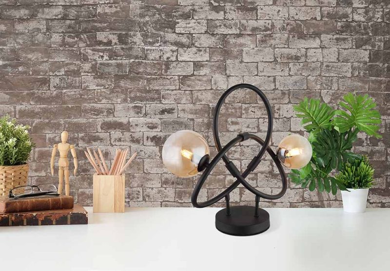 Lámpara de mesa negra girada 2 bolas de vidrio ámbar Globo Tuberius