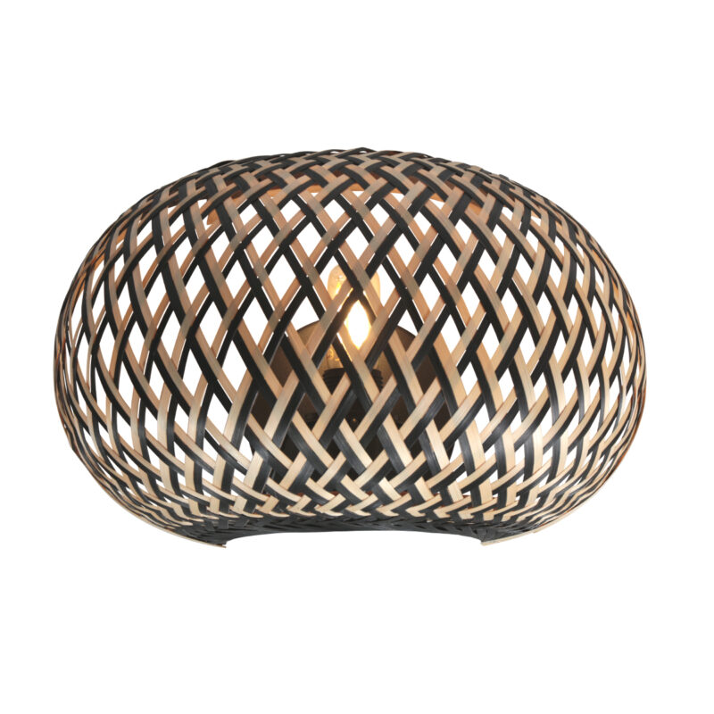 Esta lámpara de pared está hecha de bambú trenzado y tiene una forma orgánica y redondeada. La combinación de bambú natural con acentos negros le da a la lámpara un carácter lúdico y natural. La estructura de trenzado abierto permite que la luz se filtre de manera vibrante a través del material, creando un efecto luminoso cálido y decorativo en la pared.