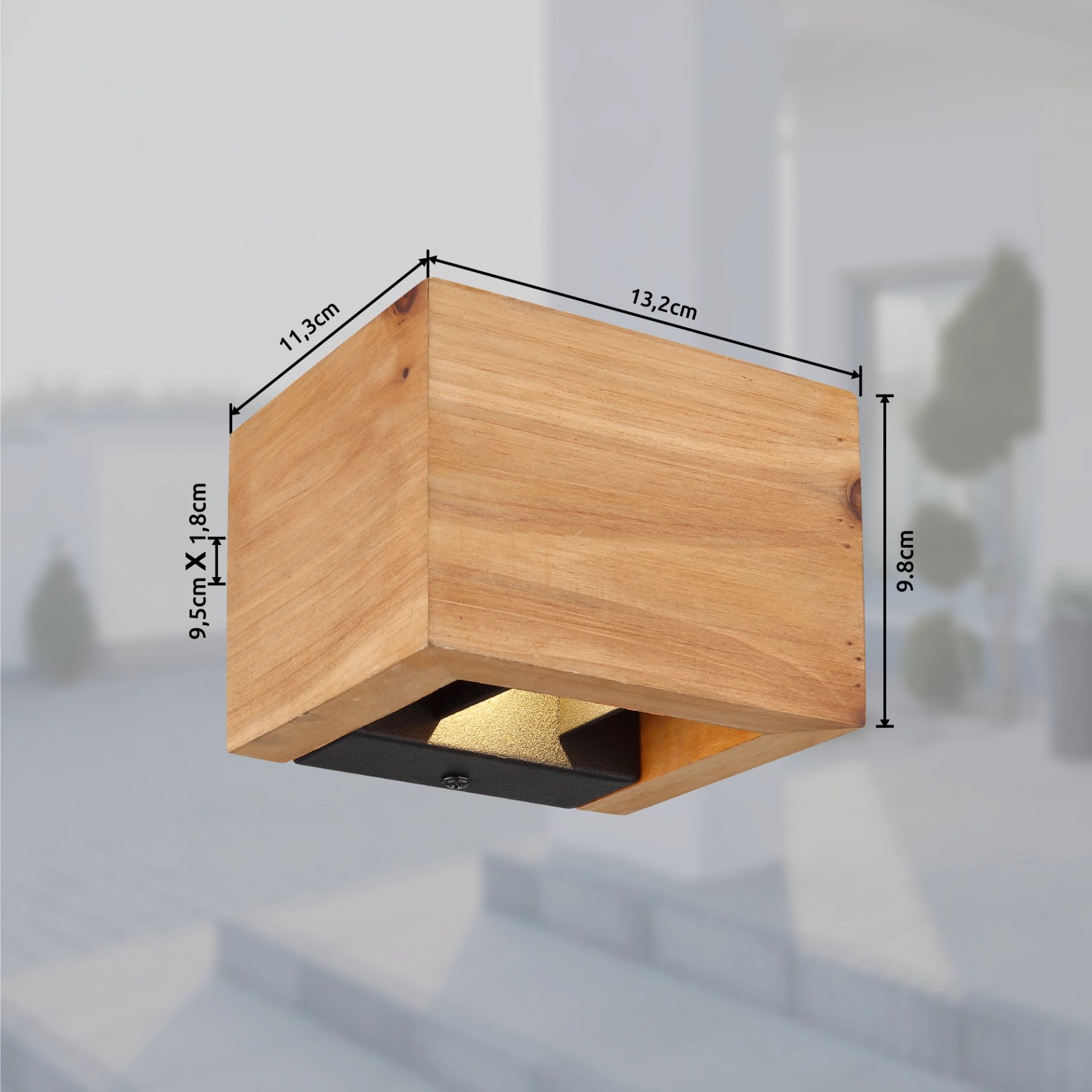 La lámpara de pared de la serie Alina es una adición moderna para cualquier interior. Con una altura de 9,5 cm y un ancho de 13,5 cm, esta lámpara tiene la apariencia de un cubo de madera, completo con un voladizo elegante de 11,5 cm. La lámpara, que crea un ambiente acogedor, está equipada con un bombilla integrada que emite luz blanca cálida con una temperatura de 3000 Kelvin, lo que proporciona a tu espacio una atmósfera acogedora e invitadora.