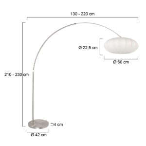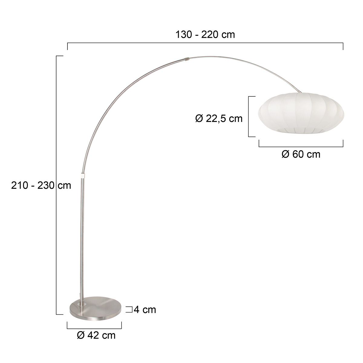 La lámpara de arco de color acero de la serie Sparkled Light de Steinhauer cuenta con un moderno marco de acero cepillado y una pantalla de seda blanca con un diámetro de 60 cm. La base E27 es adecuada para diversas fuentes de luz de hasta 40W. La lámpara se puede ajustar en altura hasta 240 cm y tiene una longitud de extensión de 230 cm. Con un cable de 250 cm y un interruptor de pie, esta lámpara de diseño es tanto práctica como estilosa. Ideal como iluminación ambiental en la sala o en el dormitorio. Incluye una garantía de fábrica de 2 años.