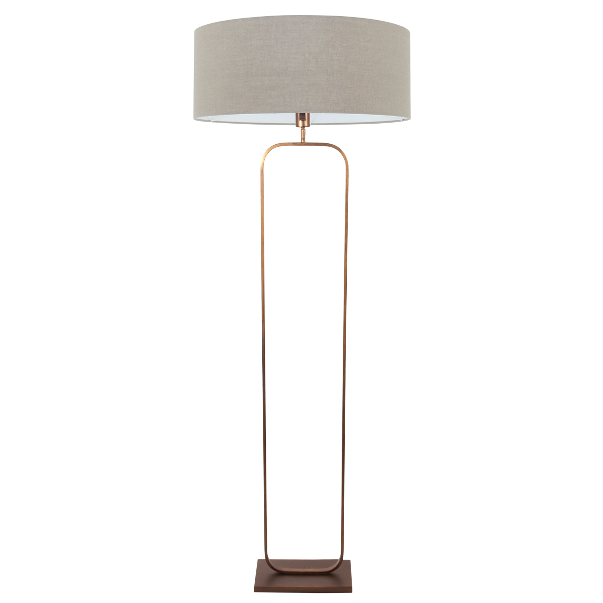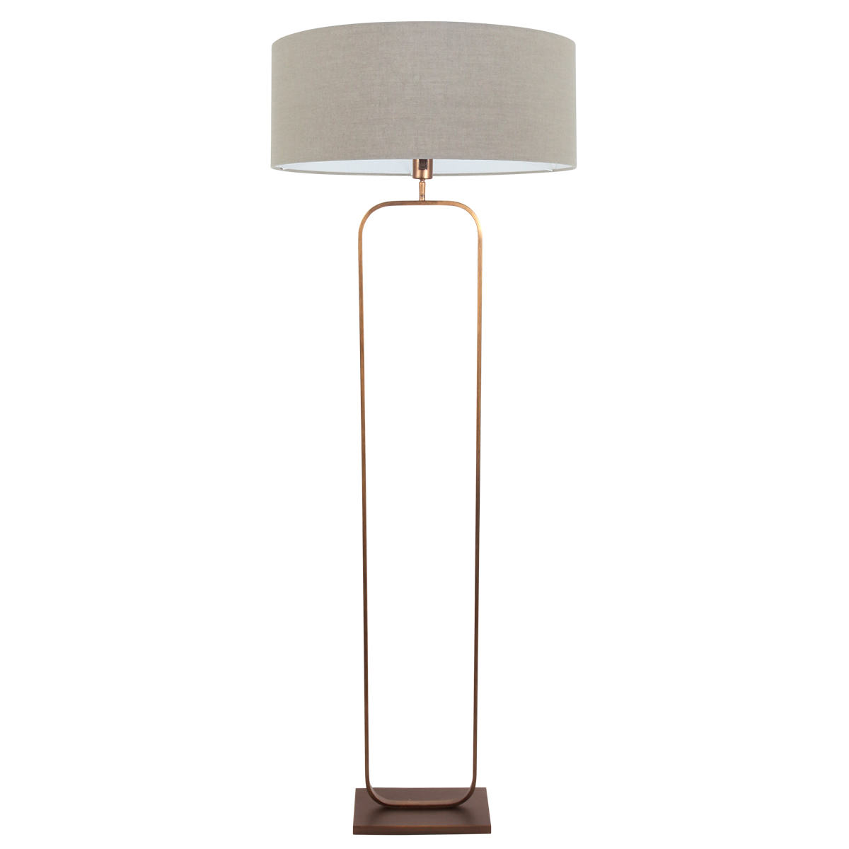 Esta lámpara de pie de bronce combina un cálido marco metálico con una pantalla en forma de tonel de lino gris rugoso. La estructura visible del tejido proporciona una suave dispersión de la luz y añade carácter a la habitación. Este modelo es perfecto para interiores modernos, industriales y atemporales donde la textura y el ambiente son importantes.