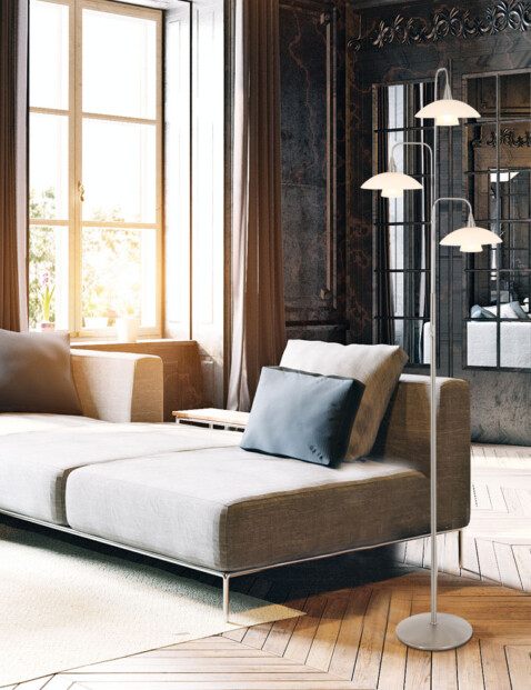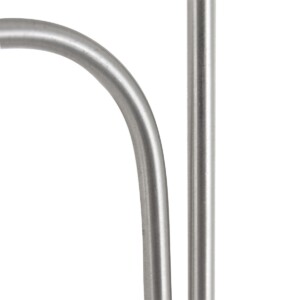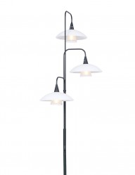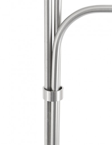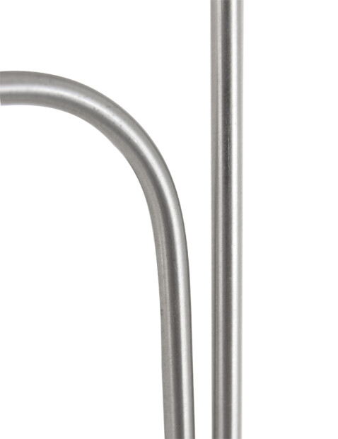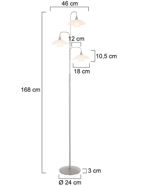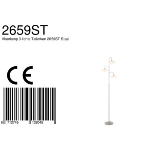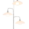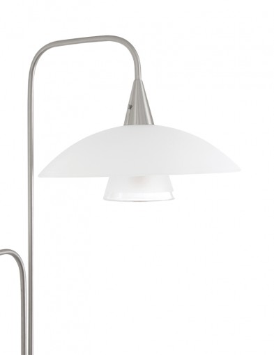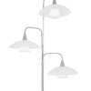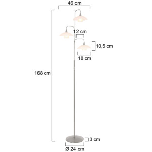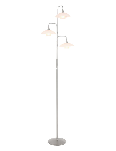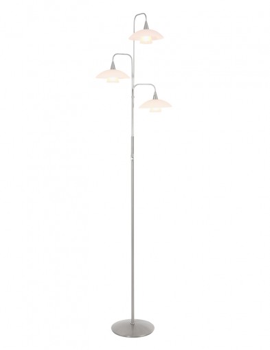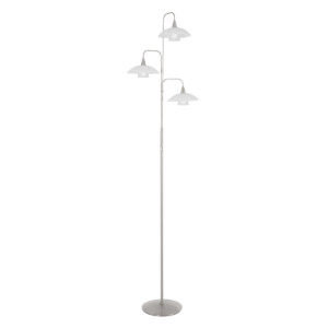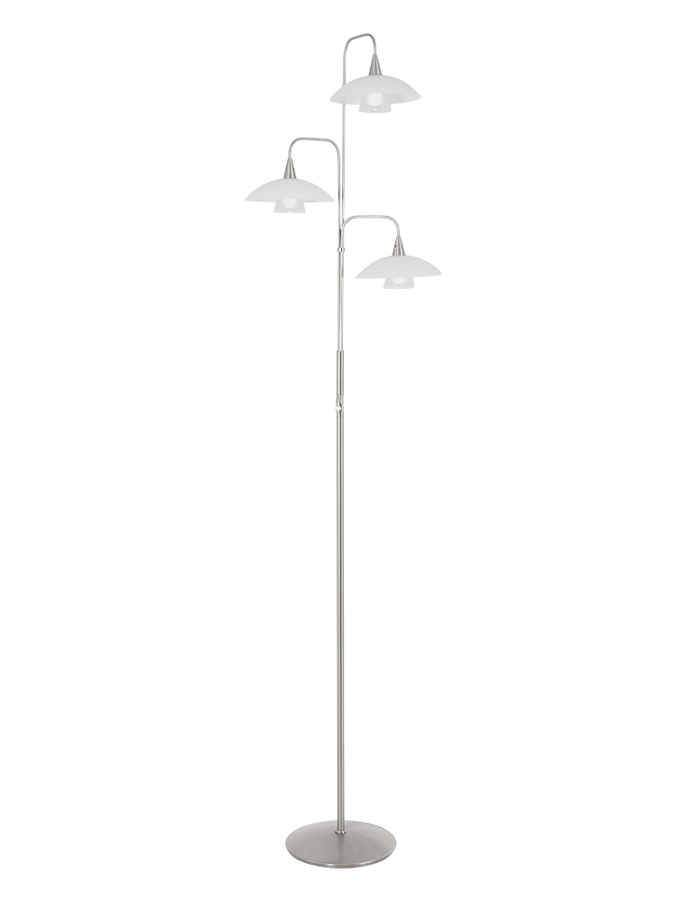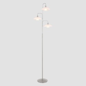 La lámpara de pie de color acero de la serie Tallerken tiene un diseño elegante con tres puntos de luz. Los tubos de acero terminan en platos de vidrio, cada uno de los cuales contiene un cilindro de vidrio blanco para una suave difusión de la luz. Gracias al regulador de pulso incorporado en la estructura, la intensidad de la luz se puede ajustar fácilmente. Incluye tres fuentes de luz LED G9 de 3 vatios con una salida de luz de 300 lúmenes y una temperatura de color de 2700 Kelvin.