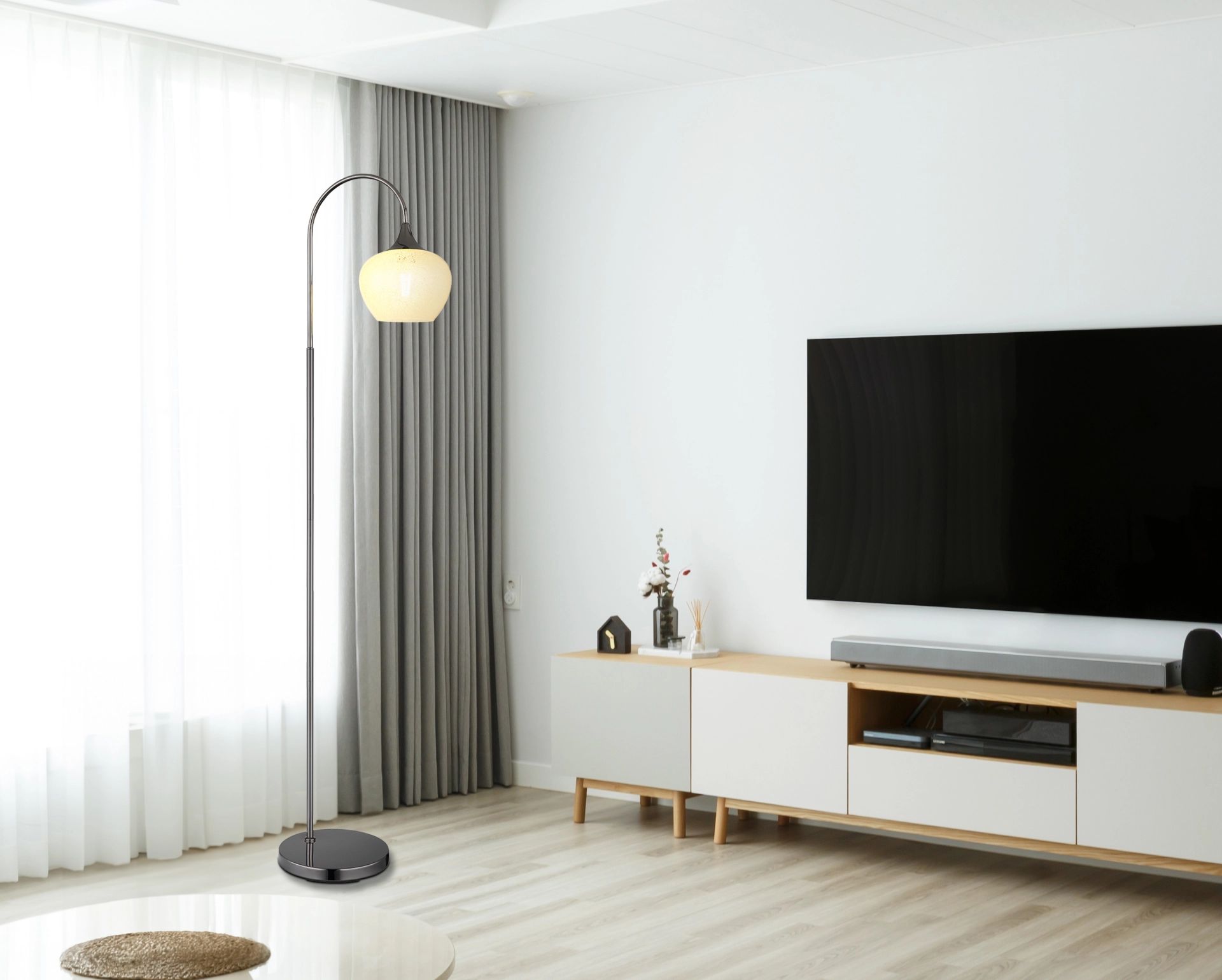 La lámpara de pie MAXY es la mezcla ideal de elegancia y funcionalidad. Con un tubo metálico limpio y una pantalla de vidrio en forma de bola, que está hermosamente decorada con cristales, esta lámpara aporta un aire de lujo a cualquier espacio. El cuerpo en cromo negro y la pantalla de vidrio clara con cristales acrílicos permiten una distribución armónica de la luz, iluminando cada rincón de la habitación.
