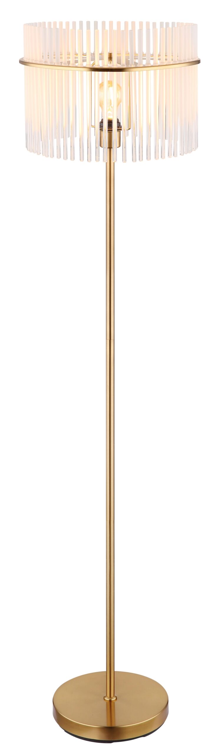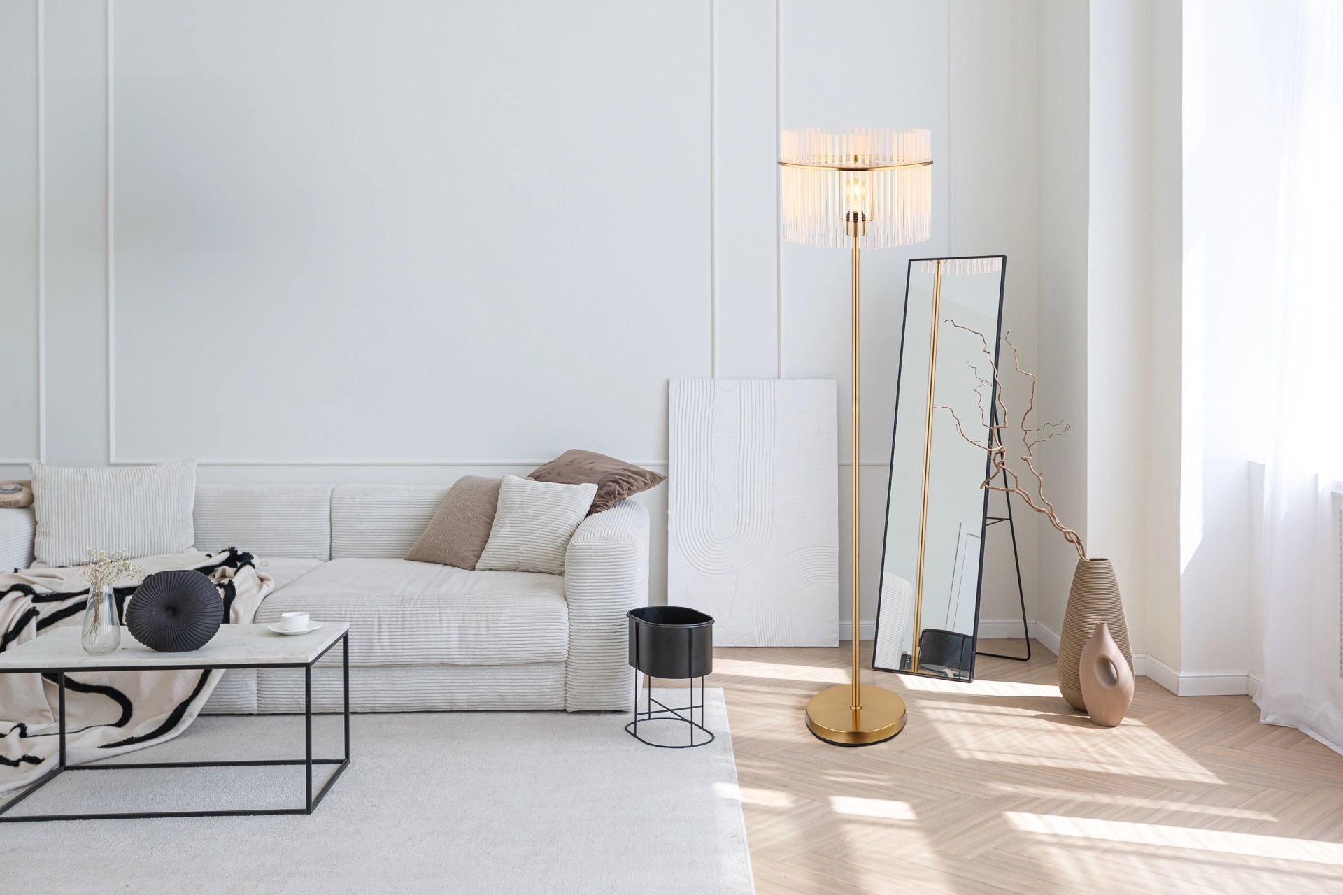 La lámpara de pie GORLEY es una fuente de luz elegante que transforma cualquier espacio y crea un ambiente cálido. La pantalla redonda, fabricada en vidrio opalino y varillas de vidrio claro, ofrece un degradado sutil que dispersa la luz de una manera única. El marco metálico mate en color dorado añade un toque chic, lo que da a la lámpara un aspecto estiloso. Gracias al práctico interruptor de pie en el cable, es fácil encender y apagar la lámpara, lo que contribuye a su facilidad de uso.
