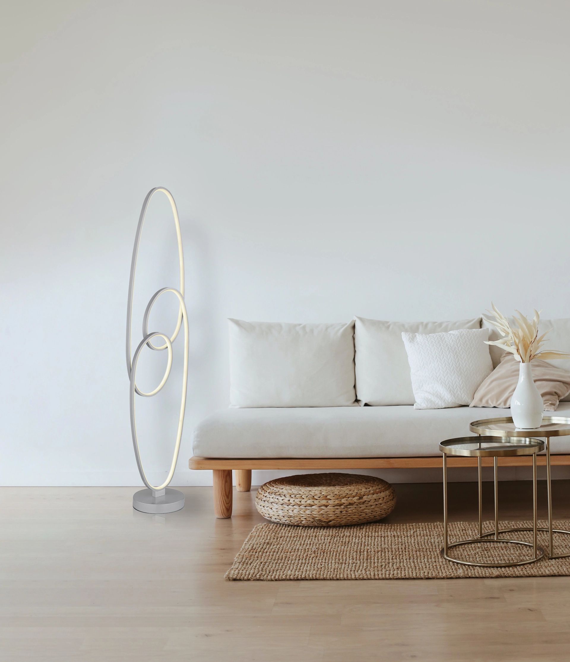 Conoce la lámpara de pie metálica SPIRA en plateado, una mezcla armoniosa de diseño y funcionalidad. Esta lámpara de pie moderna es el complemento perfecto para interiores contemporáneos, con su forma ovalada única y elegantes bucles que sostienen la pantalla. La pantalla está hecha de aluminio y tiene un acabado plateado mate, mientras que el cuerpo de la lámpara está fabricado en metal con un diseño plateado brillante. La pantalla de plástico cuenta con un acabado opalino que proporciona una iluminación cálida y color crema, lo que hace que esta lámpara sea tanto estilizada como acogedora.