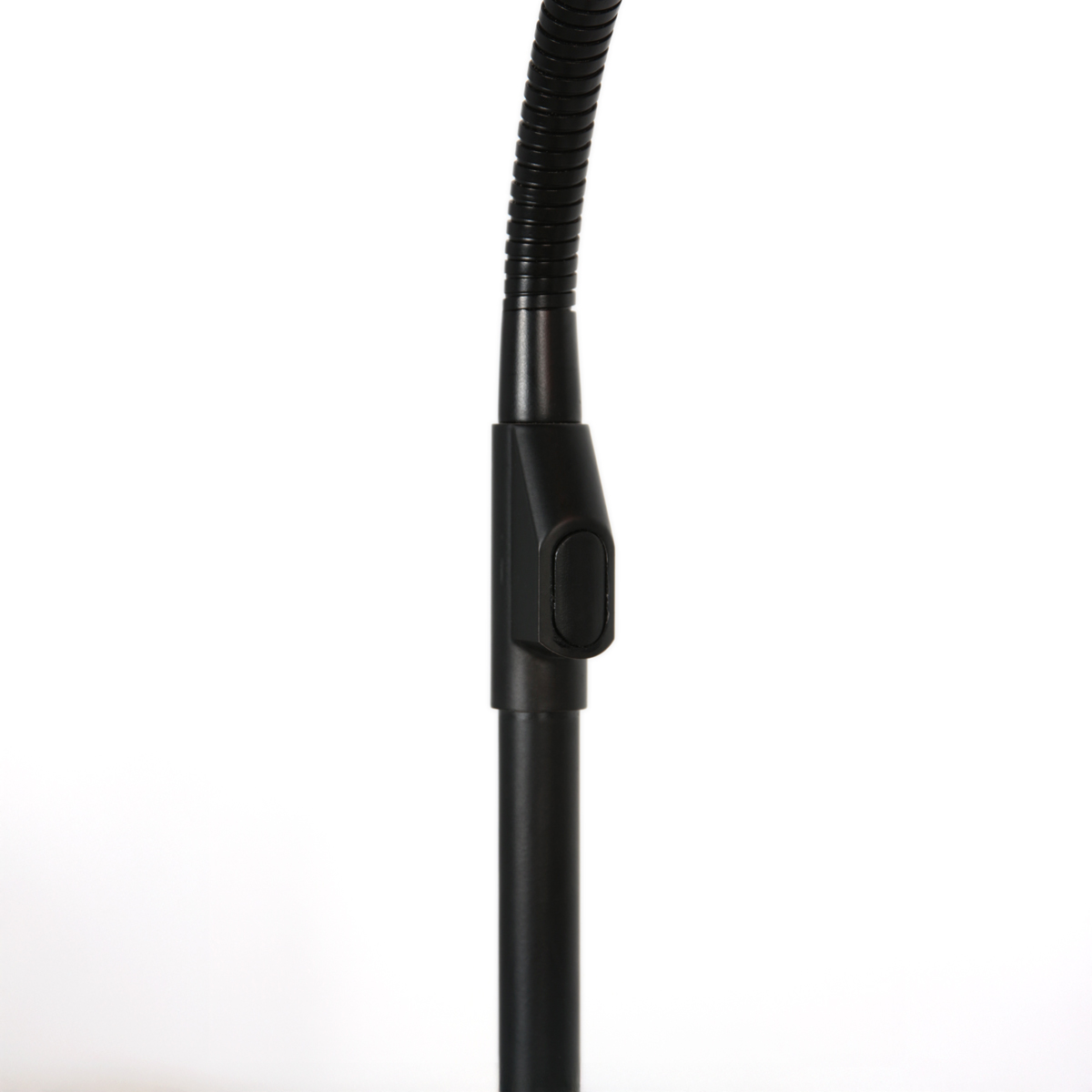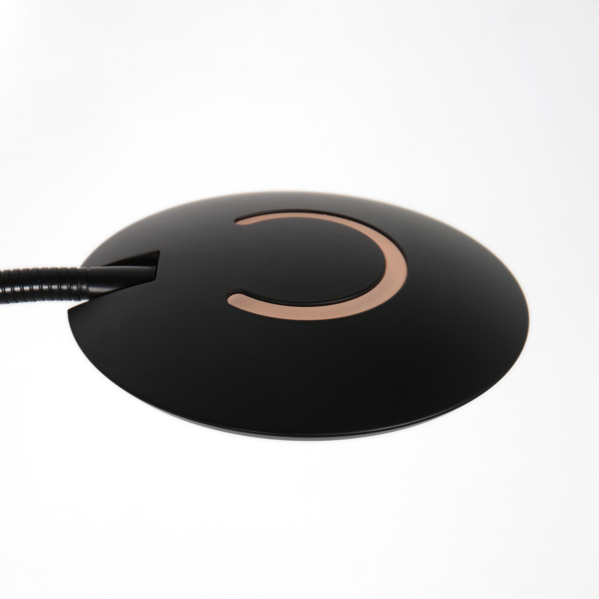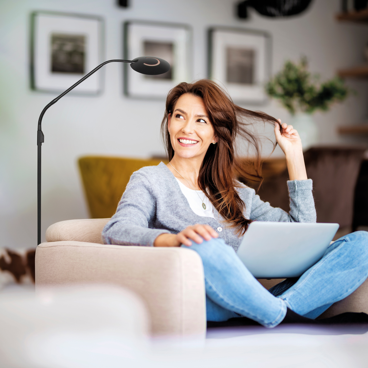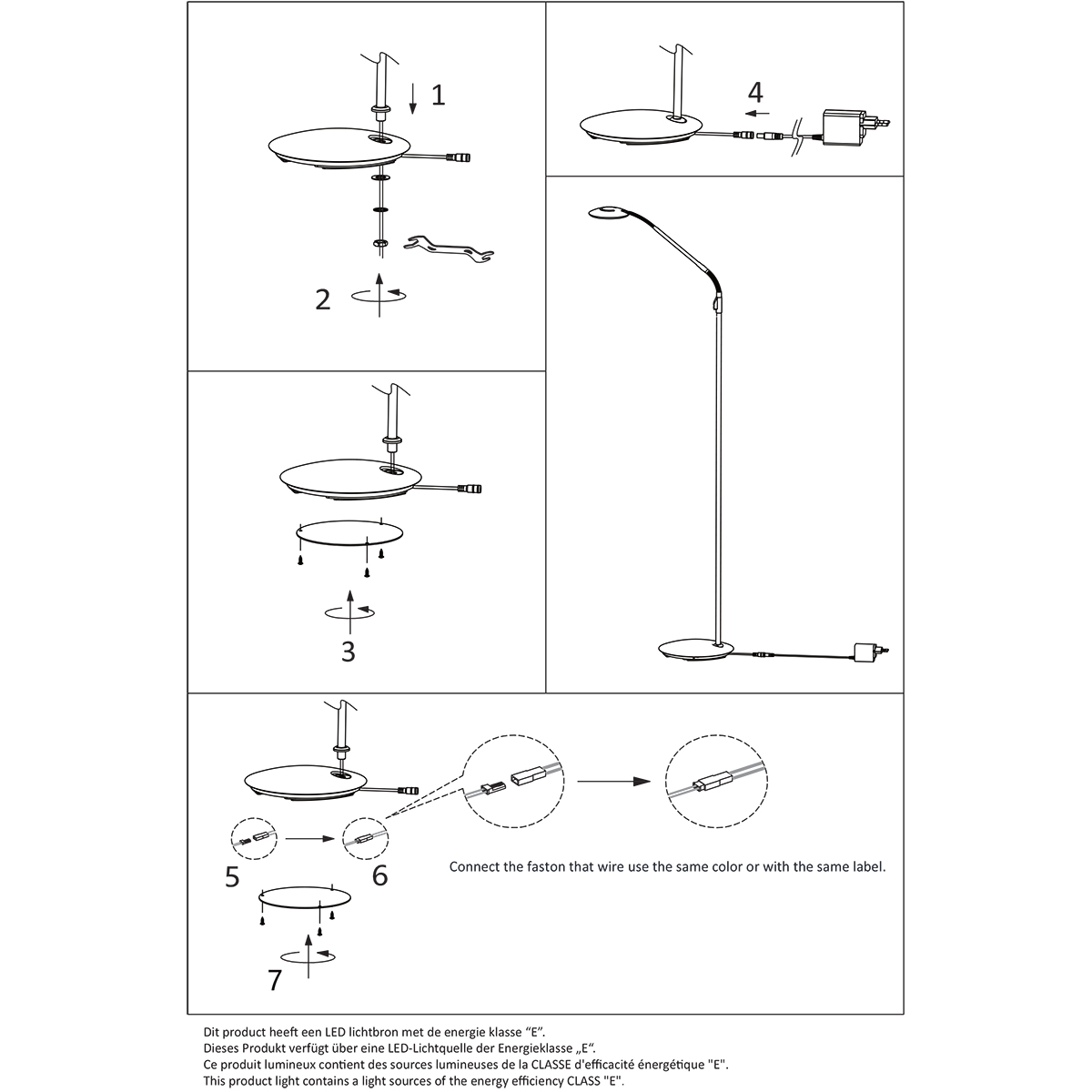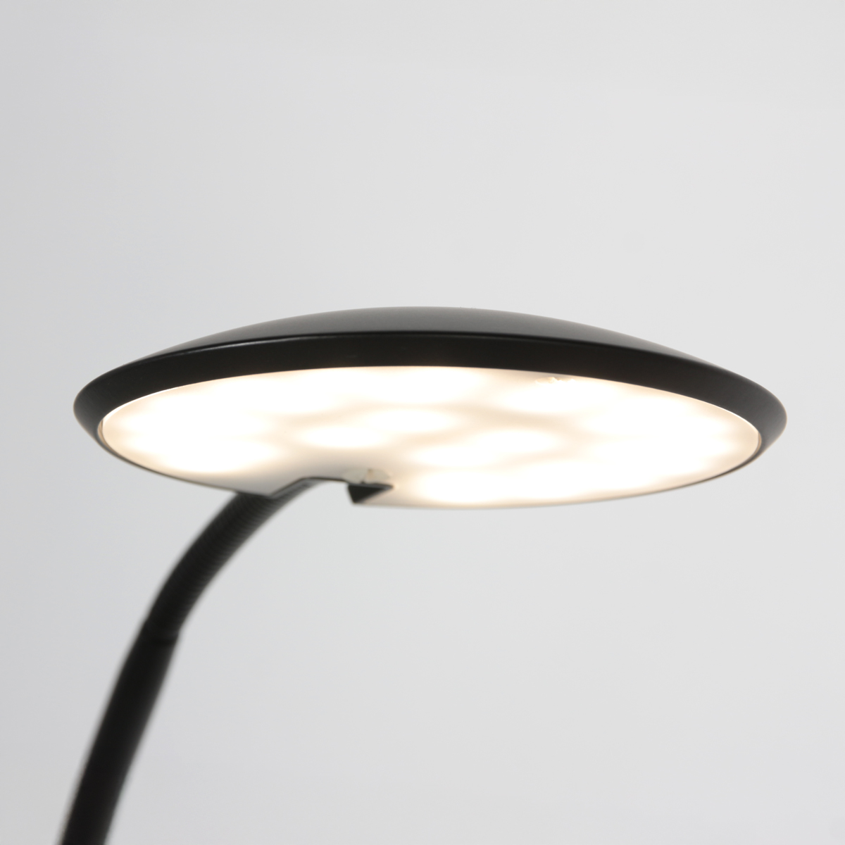 La LED integrada de 8 vatios ofrece 1040 lúmenes con un CRI de 90. La temperatura de color es ajustable de 2200 a 4000 Kelvin y la lámpara es regulable a través del dimmer de pulsación o el control remoto. Con una altura de 135 cm y un cable de 210 cm, la lámpara se puede colocar de manera flexible.