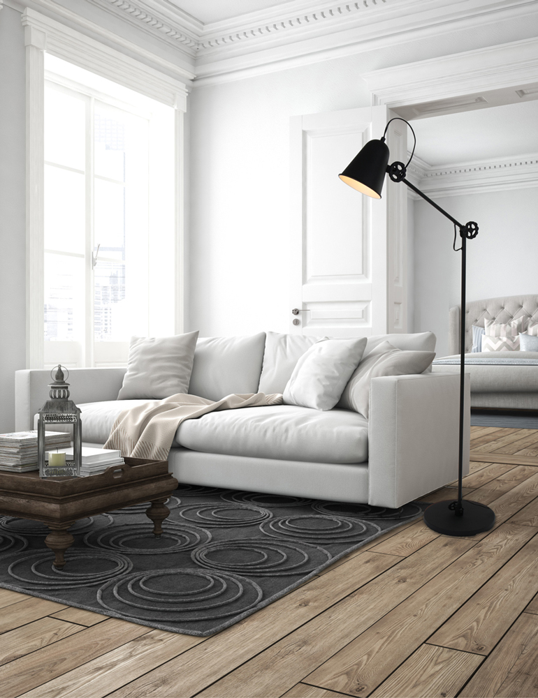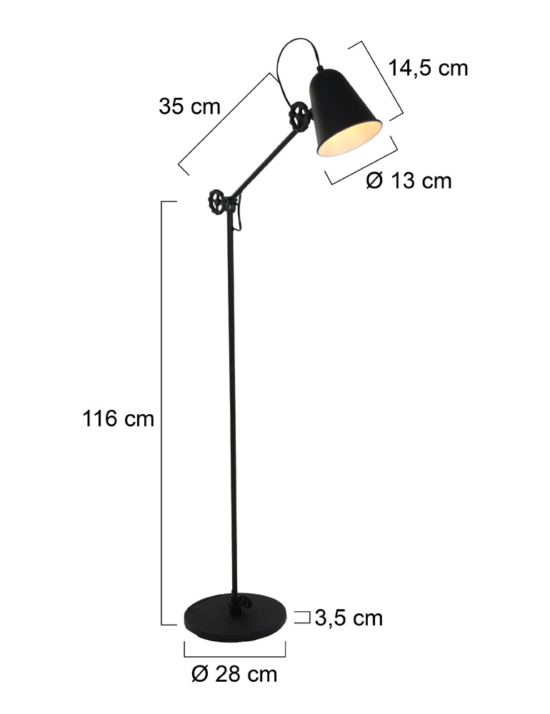 Esta lámpara de pie ajustable de la serie Dolphin combina un diseño escandinavo elegante con detalles industriales. El marco de metal negro y el interior blanco de la pantalla proporcionan una apariencia sutil y atemporal. La pantalla tiene un diámetro de 13 cm y la altura se puede ajustar entre 116 y 160 cm. Equipado con un portalámparas E27, adecuado para fuentes de luz de hasta 40 vatios.