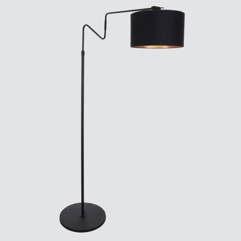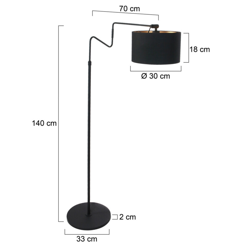La moderna lámpara de pie negra de la serie Linstrøm está hecha de metal con un recubrimiento en polvo negro. La lámpara tiene un casquillo E27 y es adecuada para fuentes de luz de hasta 40 vatios (no incluidas). El brazo ajustable tiene un alcance de 95 cm, y la altura total de la lámpara es de 140 cm. La pantalla de tela negra con interior dorado tiene un diámetro de 30 cm y una altura de 18 cm. La lámpara se entrega con un cable de 250 cm y un interruptor de pie.