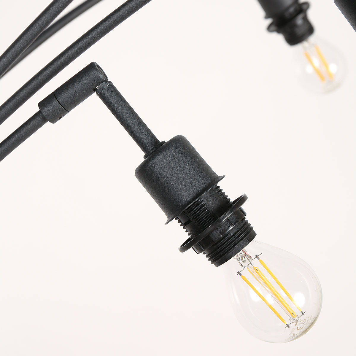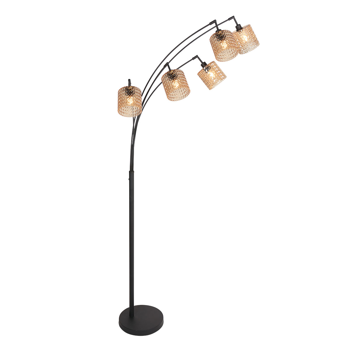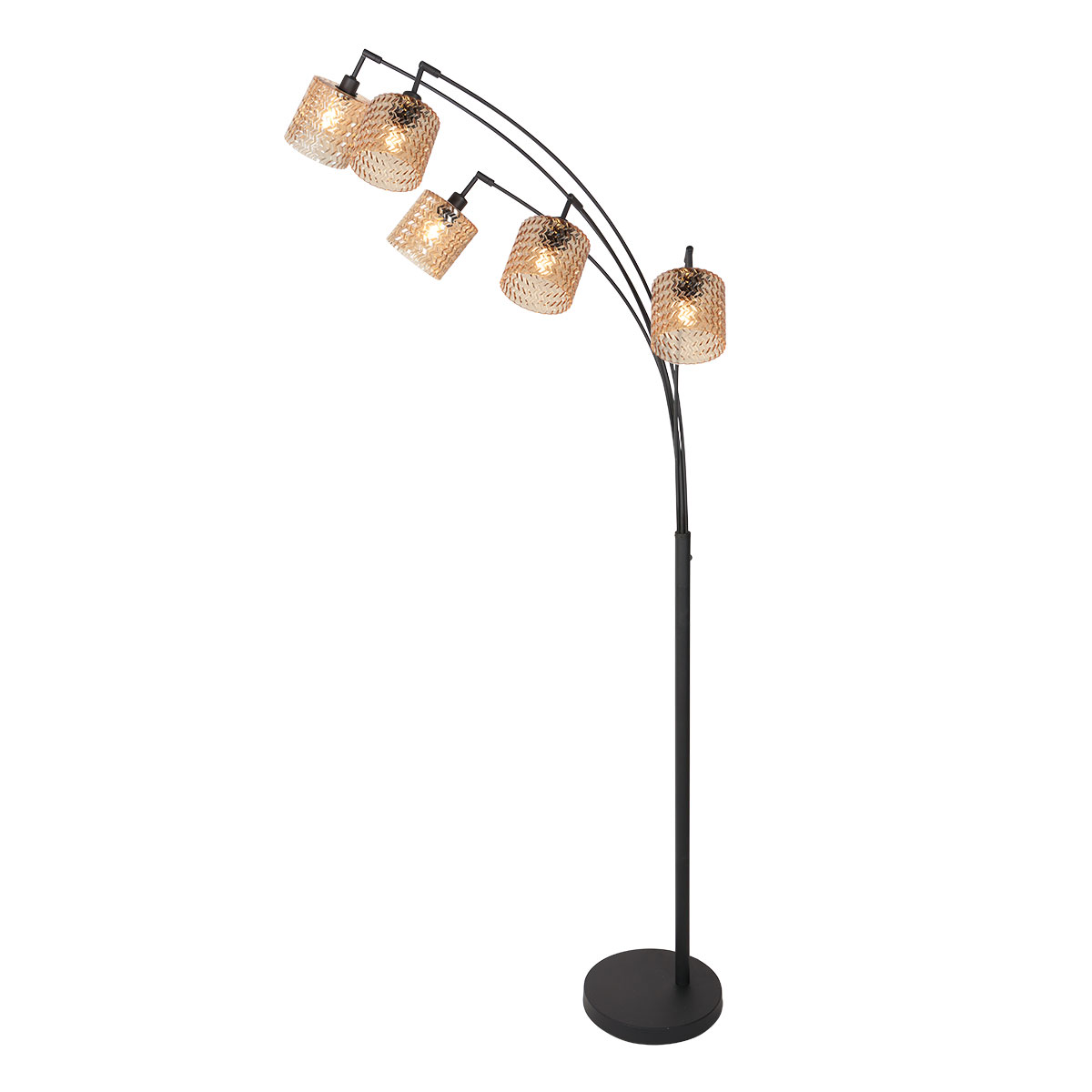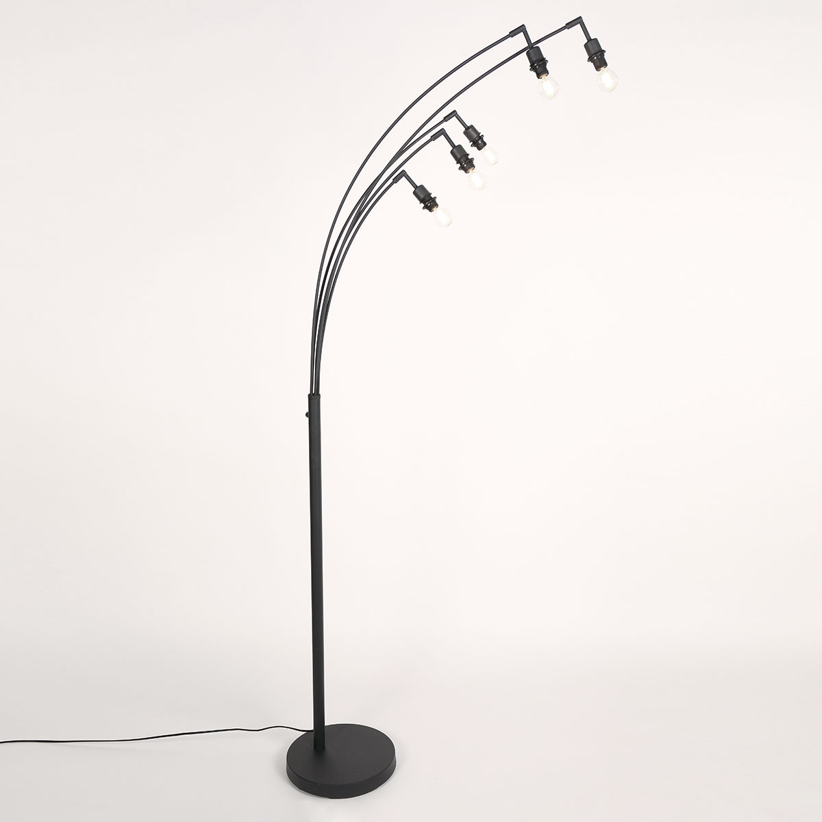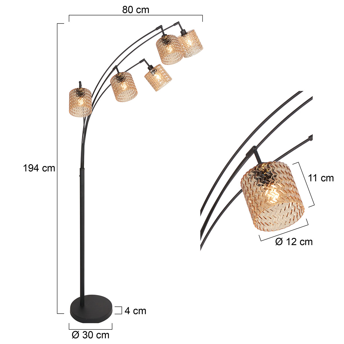 La lámpara de pie tiene una altura total de aproximadamente 194 cm y un ancho de arco de aproximadamente 80 cm. La base redonda tiene un diámetro de alrededor de 30 cm y una altura de 4 cm, lo que proporciona una colocación estable. Cada pantalla de vidrio tiene un diámetro de 12 cm y una altura de aproximadamente 11 cm, y está fijada a un brazo curvado independiente. La dispersión de los cinco puntos de luz asegura una distribución amplia y uniforme de la luz, ideal como un atractivo decorativo en la sala de estar o el rincón de lectura.