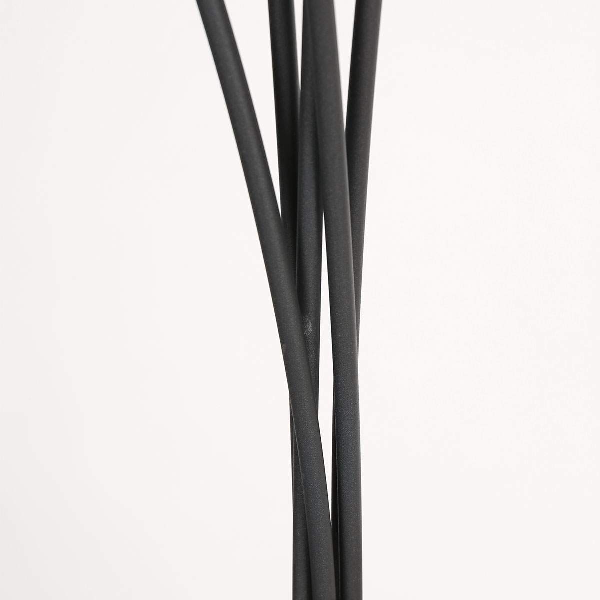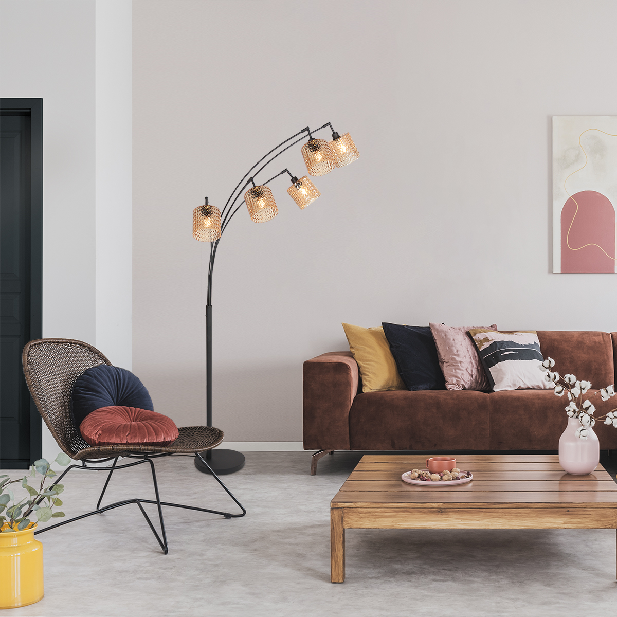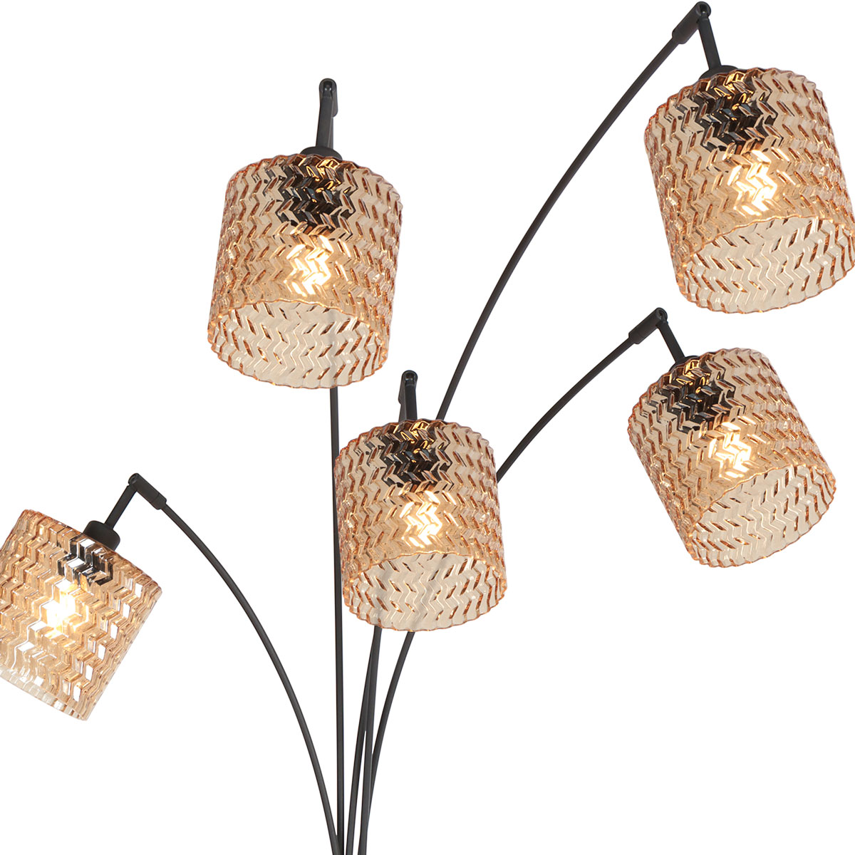 Esta lámpara de pie con forma de arco tiene un esbelto marco de metal negro con cinco brazos elegantemente curvados, cada uno equipado con una pantalla de vidrio ámbar con textura. El vidrio texturizado descompone la luz de manera juguetona y crea un efecto luminoso cálido y vibrante. La disposición de los cinco puntos de luz forma un conjunto decorativo que llama la atención de inmediato y añade atmósfera al espacio.