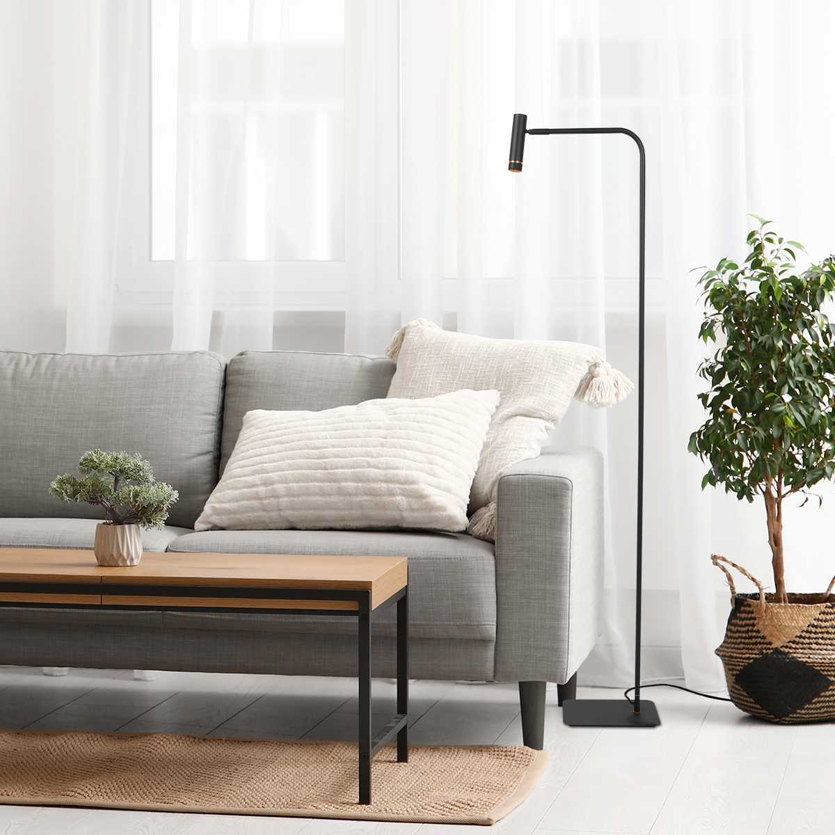 La Lumo 4607ZW presenta un diseño completamente negro y una silueta esbelta, lo que la convierte en la lámpara de pie perfecta para interiores modernos y minimalistas. Con una altura de 125 cm, es ideal para colocar junto a un sofá o un espacio de trabajo.