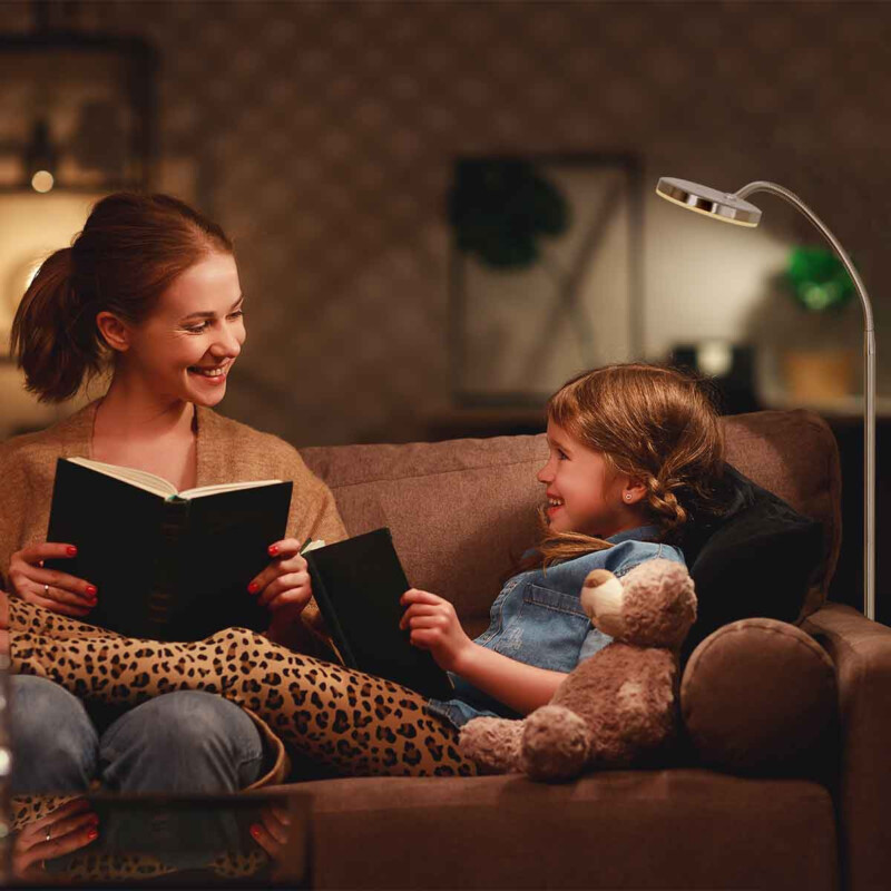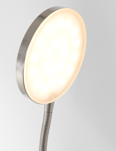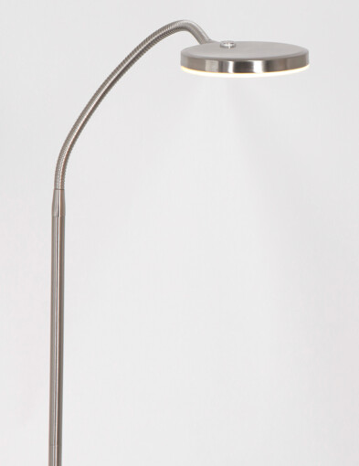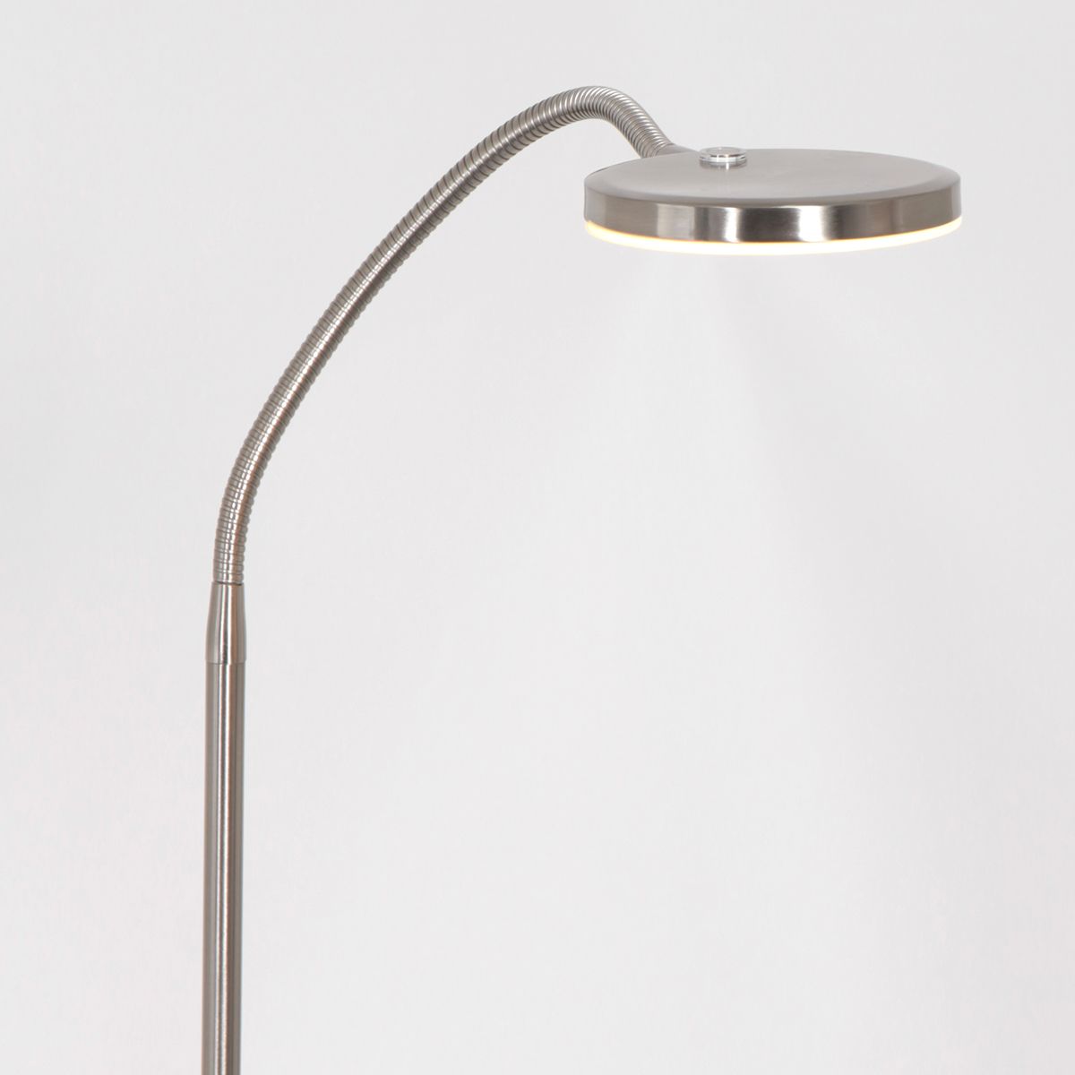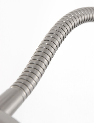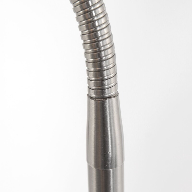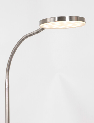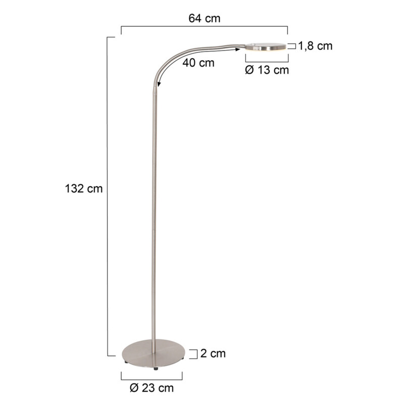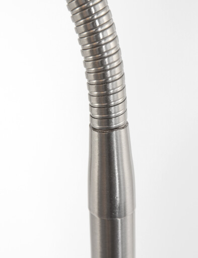 Elige una lámpara de lectura de acero para una sala de estar moderna. El brazo de la lámpara mide cuarenta centímetros y la lámpara está equipada con una base redonda. La lámpara es regulable gracias al regulador incorporado. El brazo de la lámpara de pie se puede girar y inclinar. La lámpara es eficiente energéticamente gracias al casquillo LED integrado.