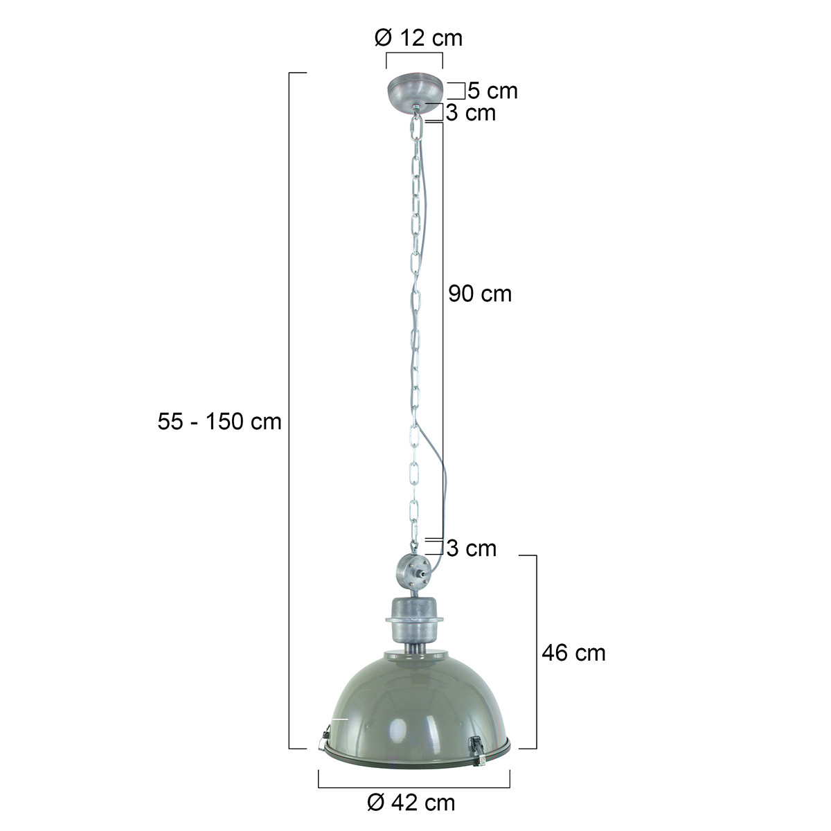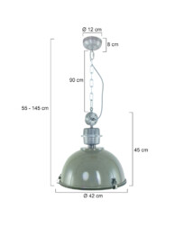 Lámpara colgante industrial verde de la serie Bikkel, con un aspecto robusto y vintage. La pantalla metálica de color verde viejo de 42 cm de diámetro tiene detalles rugosos, lo que proporciona una apariencia auténtica y robusta. La altura total de la lámpara, incluyendo el bloque del transformador, es de 45 cm y es ajustable hasta un máximo de 150 cm. Perfecta para encima de la mesa del comedor, en la sala de estar o como punto focal en un interior industrial. El difusor debajo de la pantalla evita la mirada directa a la fuente de luz y contribuye a una iluminación acogedora.