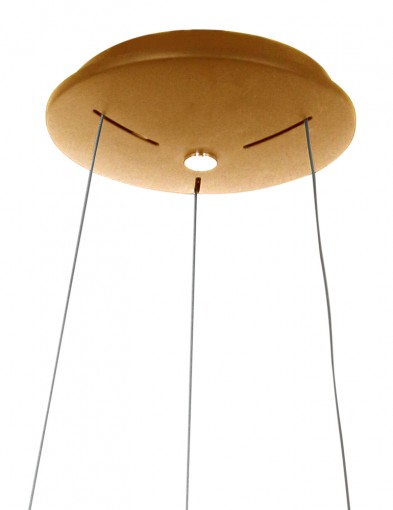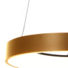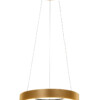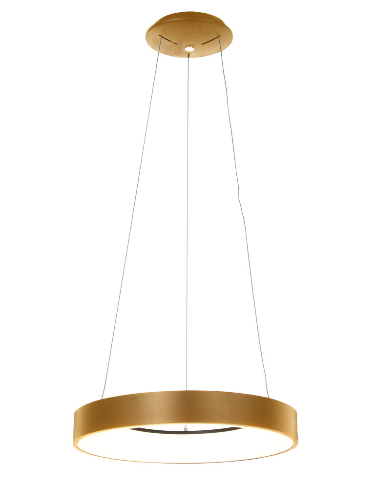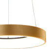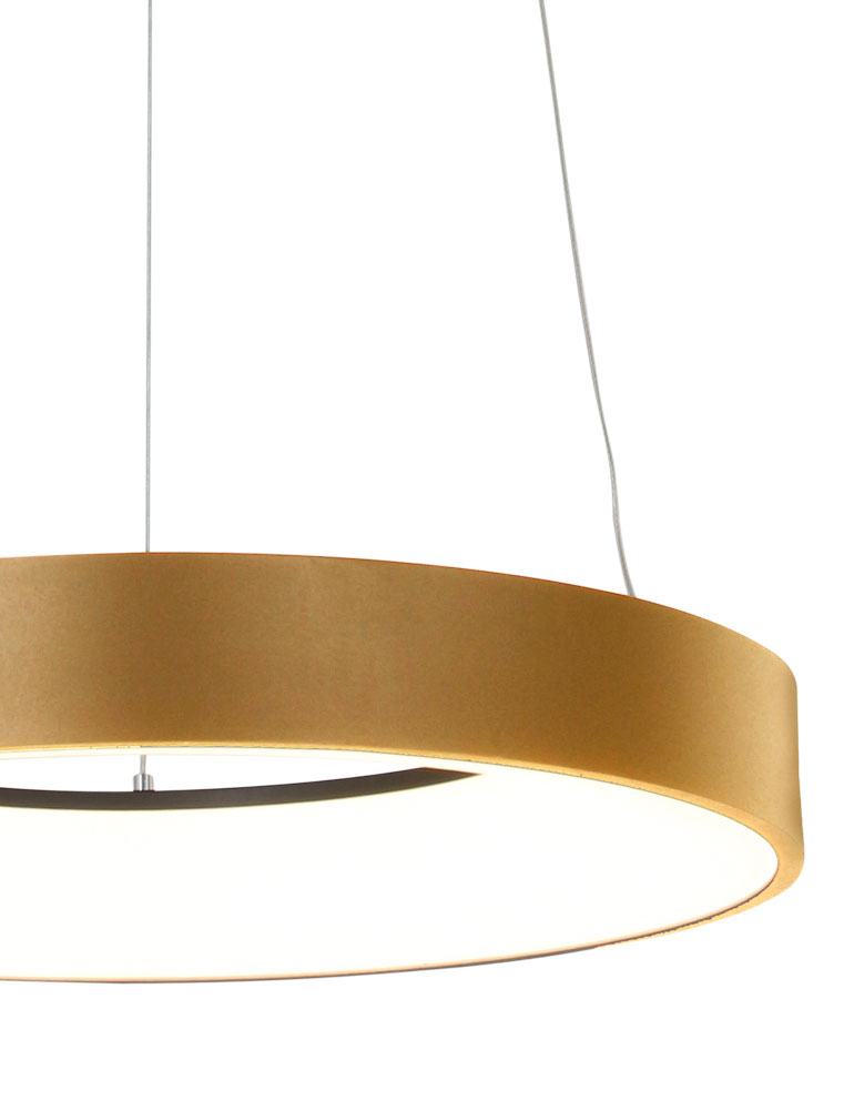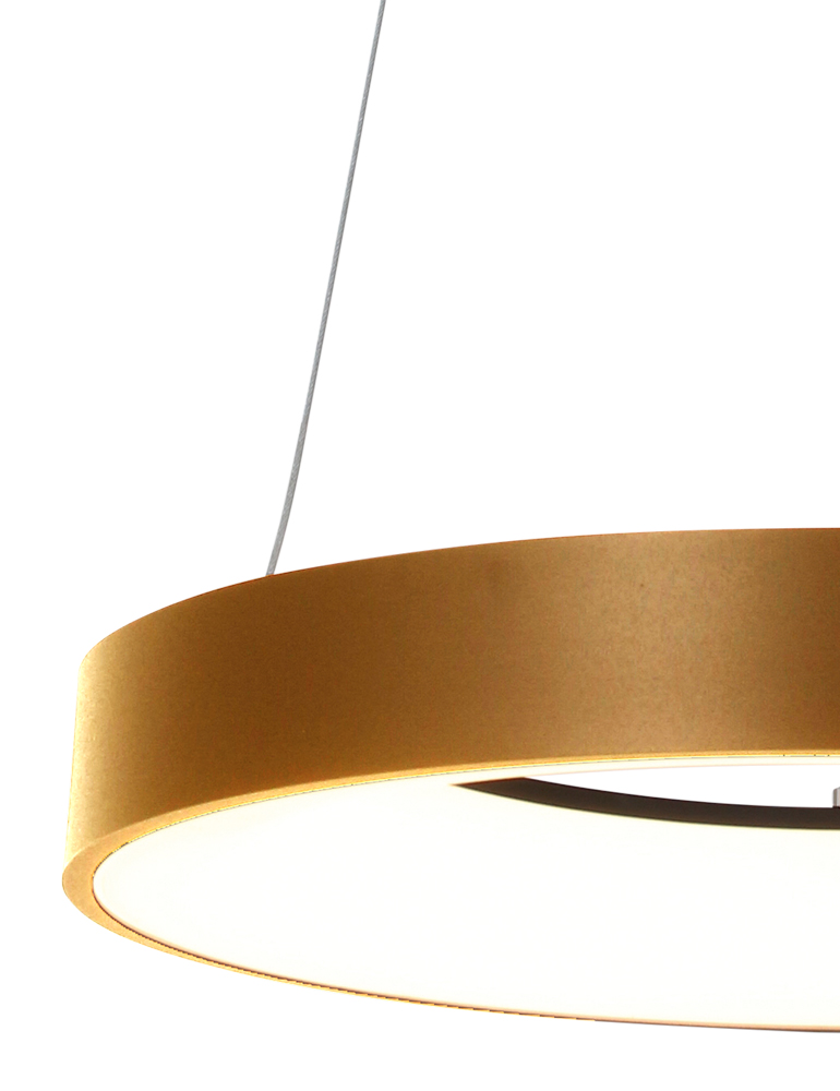 Un anillo metálico de bronce dorado sobre tres delgadas cuerdas inclinadas: esta lámpara colgante Ringlede minimalista es elegante por su color y líneas limpias. La placa de techo redonda en el mismo color aporta serenidad y unidad. La iluminación integrada y eficiente energéticamente es regulable externamente. Por su forma, la Ringlede se ve magnífica sobre una mesa redonda. Deja que este color de moda se refleje en muebles o accesorios.