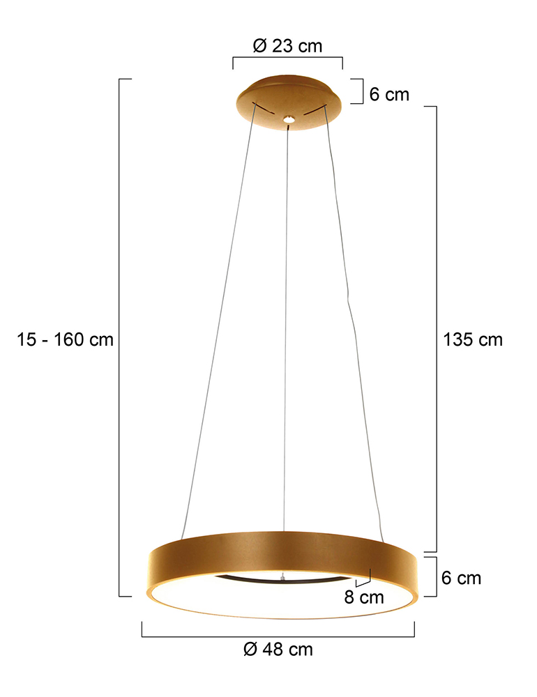 La lámpara colgante de la serie Ringlede está equipada con un módulo LED integrado de 30 vatios, con una temperatura de color de 2700 Kelvin y una salida de luz de 3600 lúmenes. La lámpara es regulable con un dimmer de pared externo (no incluido). Es ajustable en altura de 15 cm a 160 cm y tiene un diámetro de anillo de 48 cm con una altura de 6 cm.