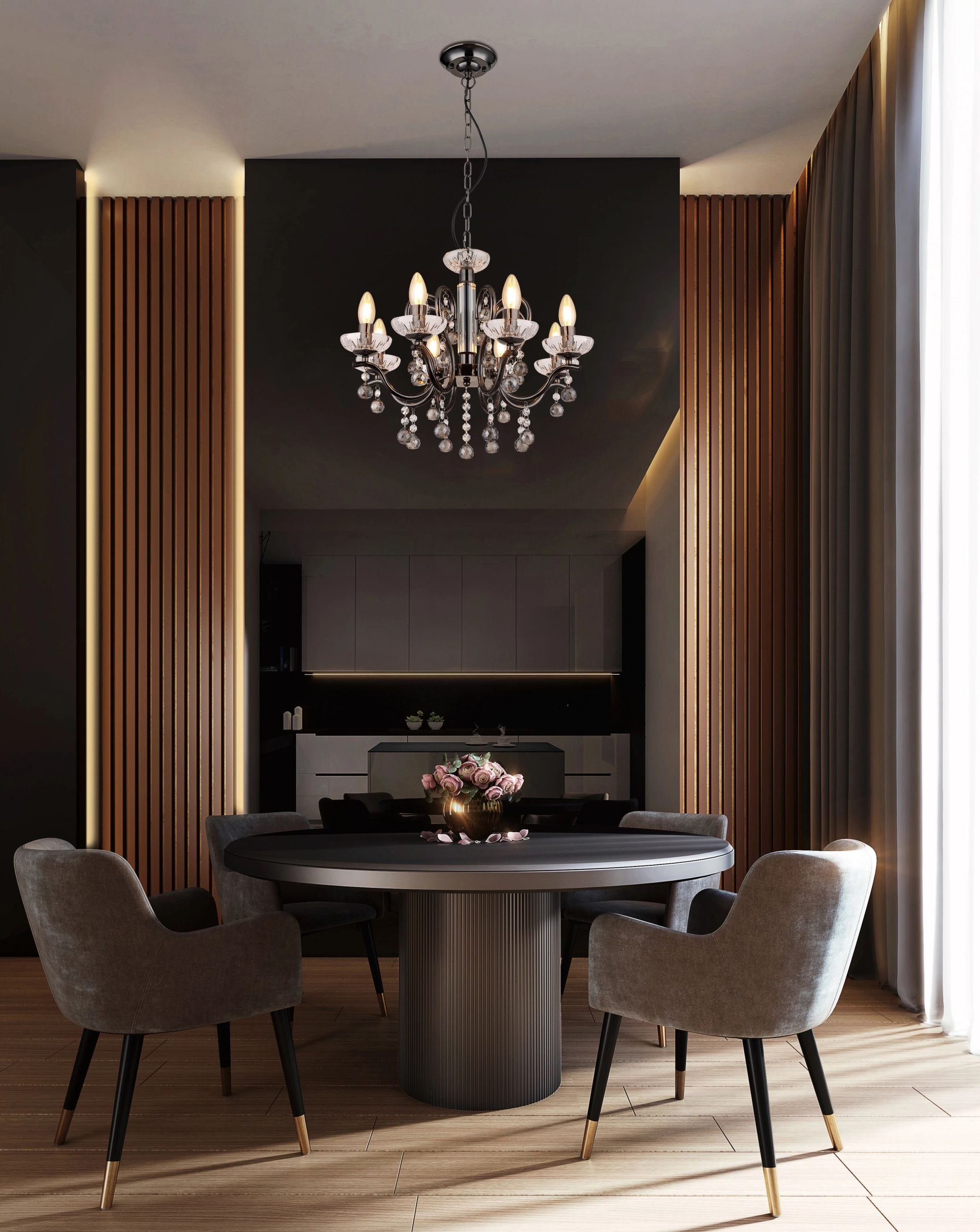 Esta lámpara de color antracita es una lámpara elegante que ofrece una mezcla armoniosa de elementos tradicionales y diseño moderno. Con su forma redonda y ocho brazos curvados con estilo, esta lámpara añade un toque refinado a cualquier espacio. El marco metálico en negro y cromo crea una atmósfera acogedora que invita a la relajación, mientras que las sombras de cristal transparente y ahumado ofrecen un hermoso contraste y difunden una luz cálida y acogedora.