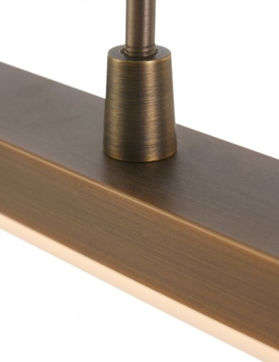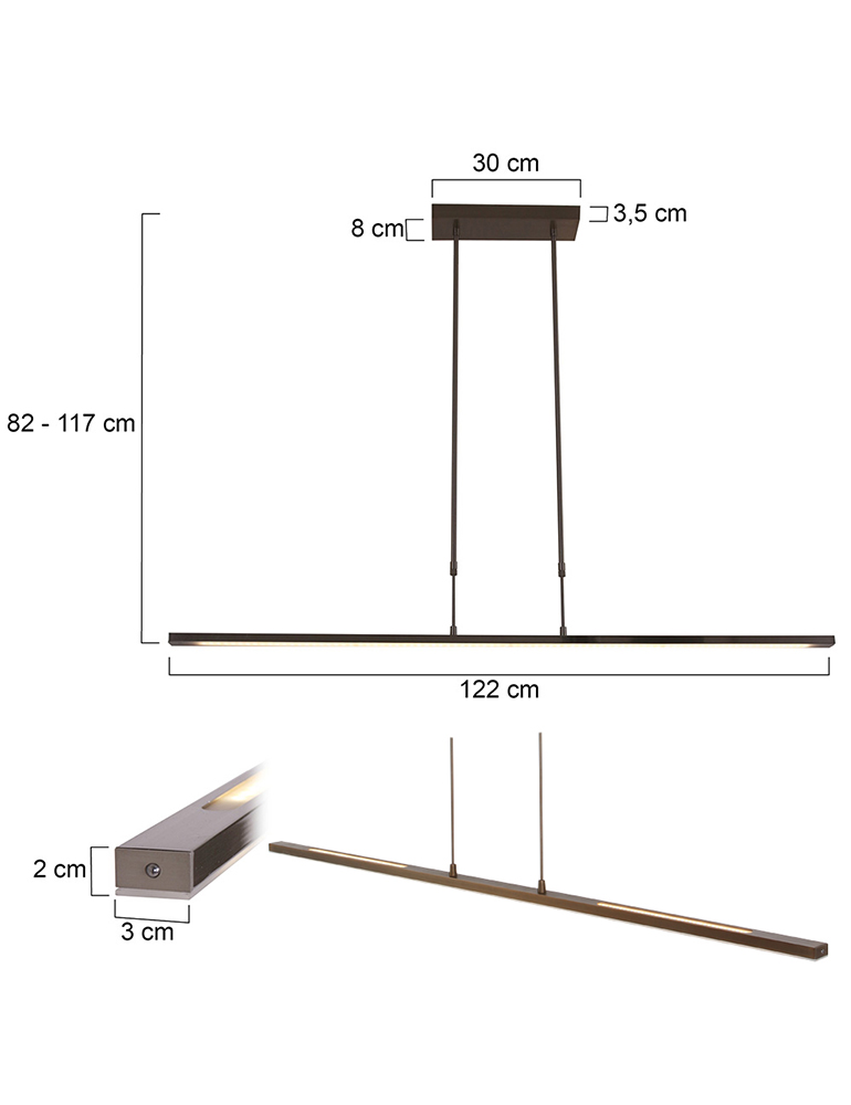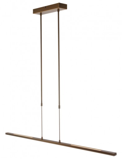 Esta lámpara colgante de bronce de la serie Zelena tiene tres puntos de luz LED integrados: dos en la parte superior y uno en la inferior, lo que crea un efecto de luz único. Con tiras LED de 2 x 4 vatios (800 lúmenes) y 17 vatios (1700 lúmenes), la lámpara proporciona una iluminación óptima. El color de la luz se puede ajustar entre 2200 y 4000 Kelvin y se puede atenuar a través de los reguladores de presión en ambos lados. Durante la instalación, la altura se puede ajustar de 82 a 117 cm, mientras que el artefacto tiene una longitud de 122 cm y un ancho de 3 cm. Esta lámpara colgante de la marca Steinhauer se entrega con 2 años de garantía.