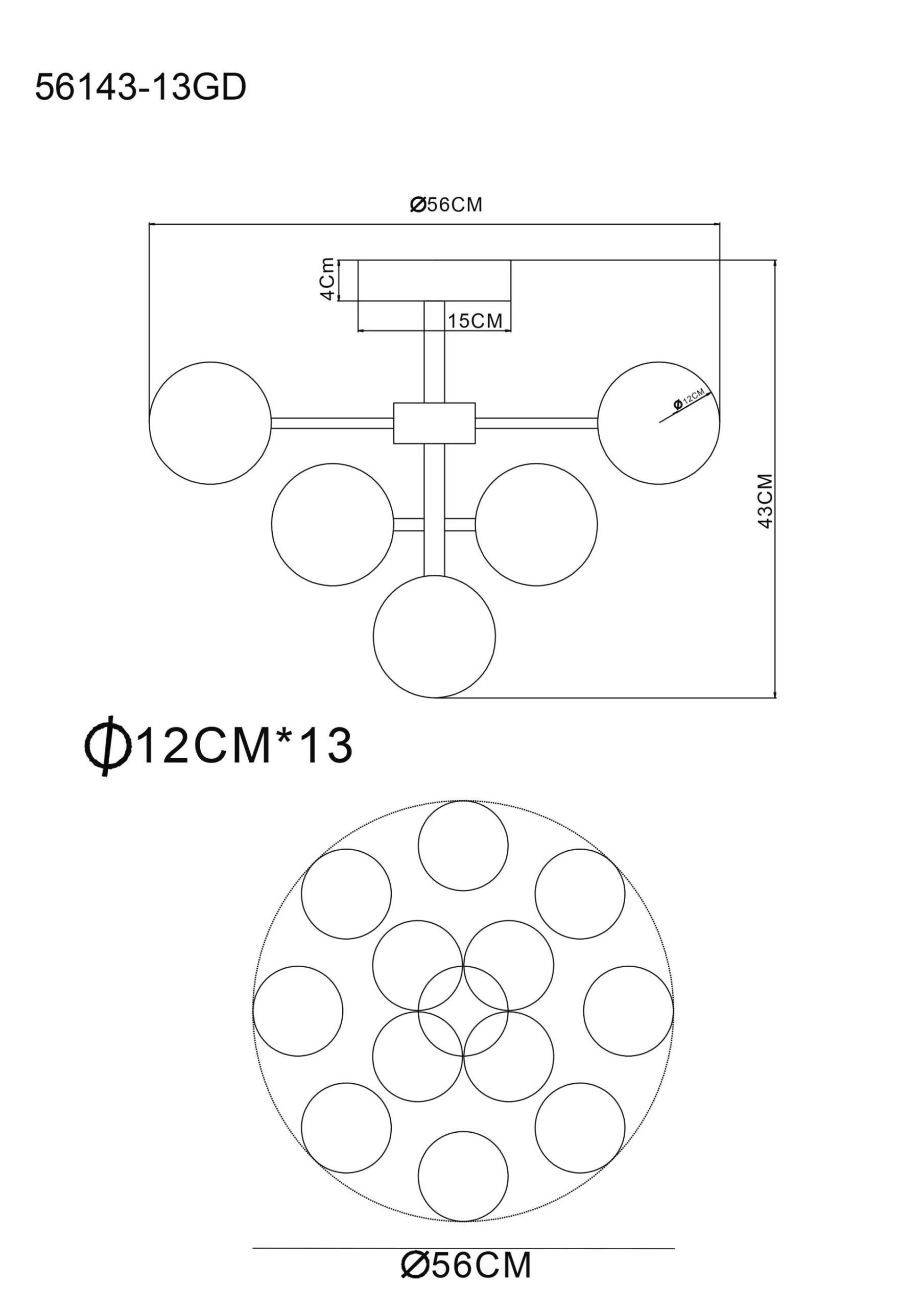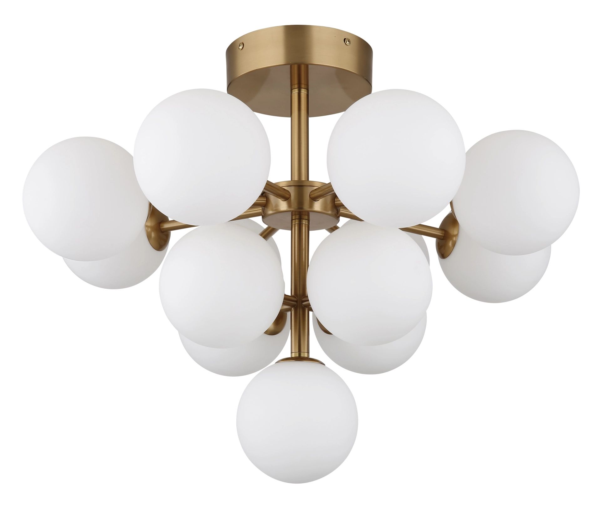 Esta elegante lámpara de techo crea una atmósfera de lujo en cualquier espacio gracias a su diseño glamuroso y a sus esferas de vidrio de color ópalo. El marco de metal dorado mate combinado con las esferas de vidrio de color ópalo le da un aspecto chic y estiloso. Con un diámetro de 560 mm, esta lámpara de techo está equipada con nada menos que 13 bombillas LED G9 integradas, que ofrecen una potente salida de luz de 5W.