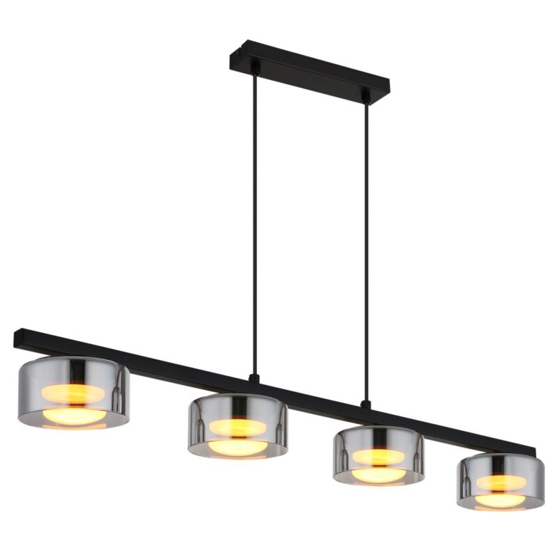 La lámpara colgante HIGGINS combina un diseño moderno con una iluminación práctica, lo que la convierte en un complemento ideal para los espacios habitables contemporáneos. Con sus líneas elegantes y cuatro pantallas redondas y planas, esta lámpara añade un toque de elegancia a su interior. La mezcla de metal negro y aluminio negro cepillado le da a la lámpara una apariencia contemporánea que se integra perfectamente en diversos estilos. Las pantallas de vidrio ahumado proporcionan una luz cálida y acogedora, contribuyendo a una atmósfera agradable en su hogar.