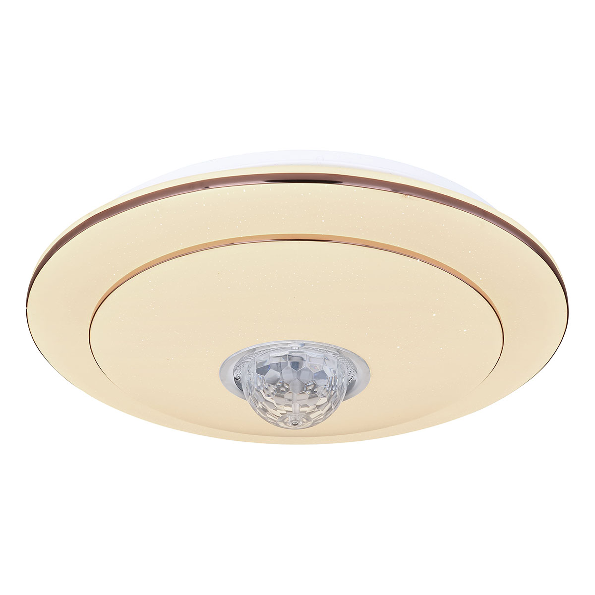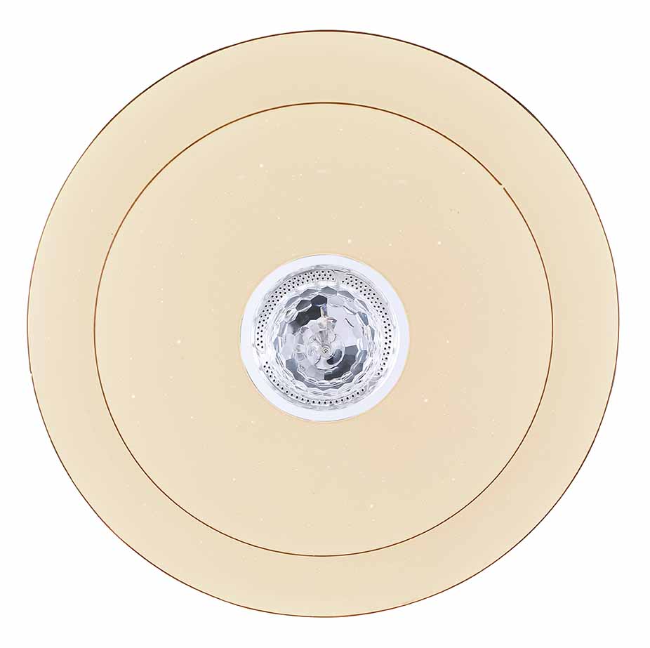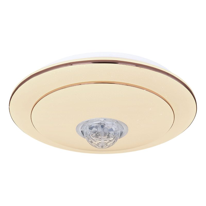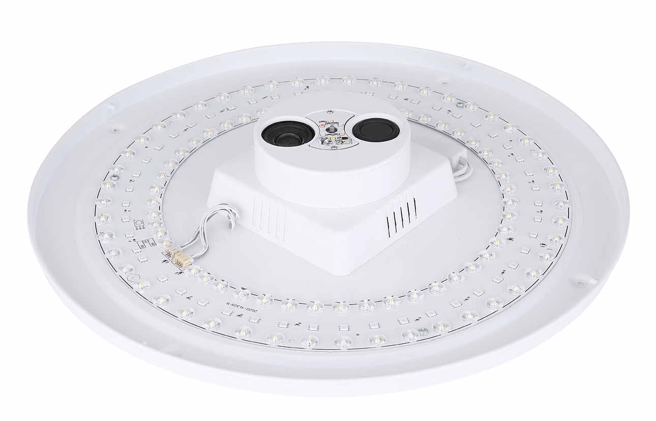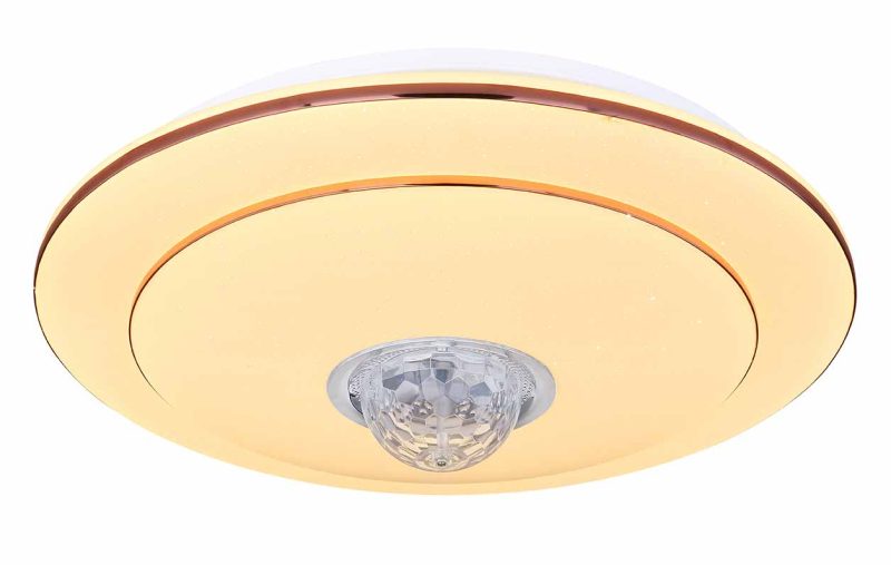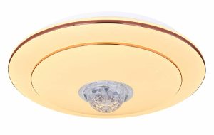 Conozca la “Santina”, una lámpara de techo versátil y de diseño clásico. Bajo la brillante cubierta decorativa Sparkle se encuentra un instrumento de luz regulable, que a través de un práctico control remoto produce diferentes temperaturas y colores de luz, satisfaciendo casi cualquier necesidad de iluminación. Desde su sillón, puede cambiar fácilmente entre blanco cálido de 3000 y blanco frío de 6000 Kelvin, mientras que con la función RGB incluso puede cambiar el color de la luz. Además, el sistema de altavoces Bluetooth integrado de 5W ilustra perfectamente la versatilidad de esta lámpara y permite transmitir su música favorita de manera fluida.
