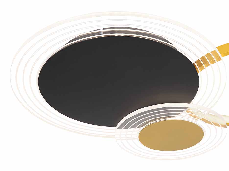 Viva la luz en toda su gloria con nuestra contemporánea lámpara de techo Senna, una combinación artística de metal negro y dorado, ambos bellamente ribeteados con acrílico claro. Ajuste la intensidad y el color de la luz, que varía de blanco cálido a frío (2700-6000 Kelvin), con el control remoto incluido, que también ofrece una función de luz nocturna. Esta lámpara, con su impresionante iluminación LED de 1900 lúmenes, se caracteriza por el hermoso anillo dorado, envuelto internamente en acrílico. Su interior recibirá un cambio completo con la adición de otros modelos de esta versátil serie.