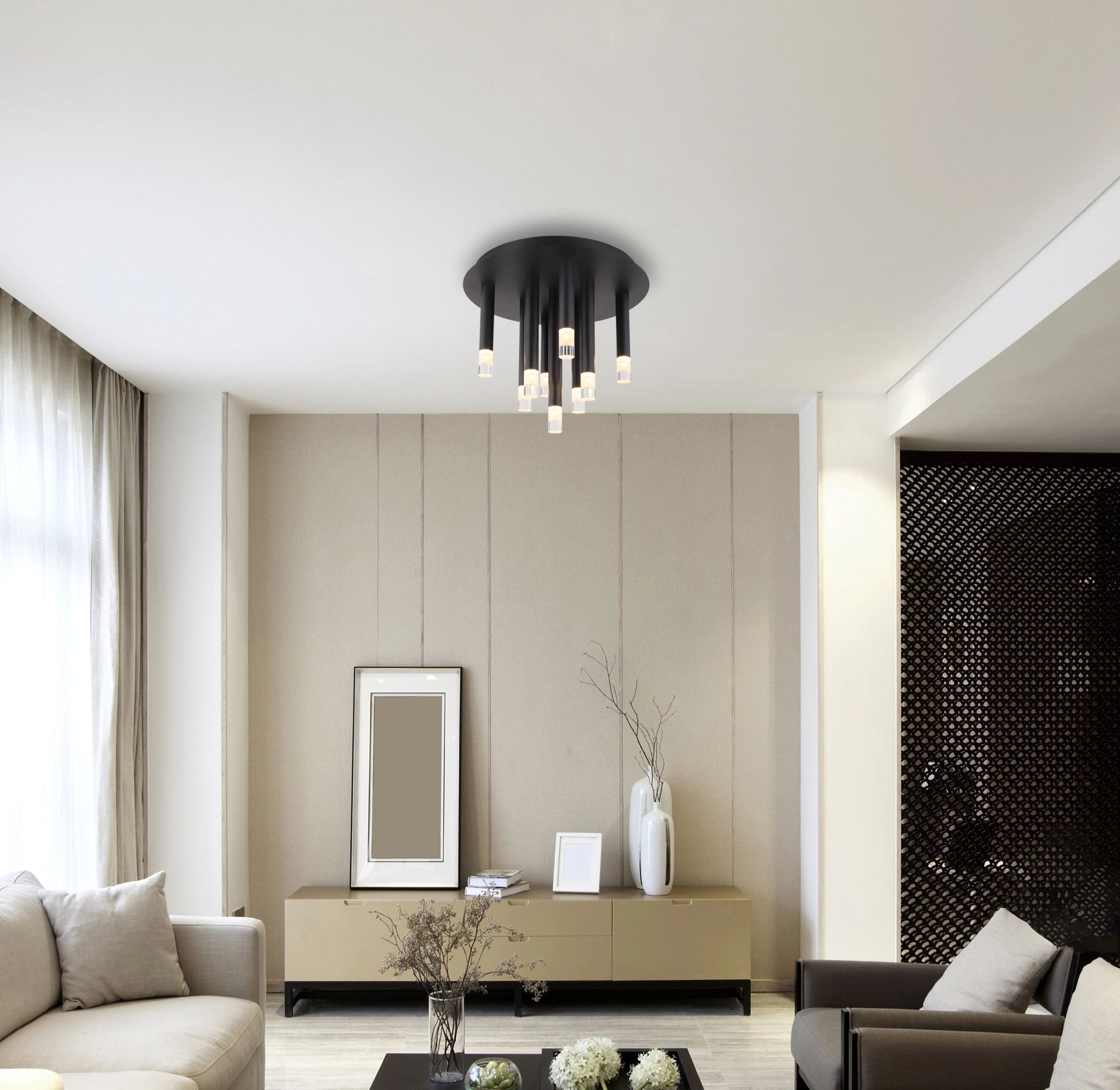Esta lámpara de techo es perfecta para el salón, el comedor o el dormitorio y se integra a la perfección con los estilos de decoración contemporáneos. La combinación de negro mate y acrílico transparente confiere a la lámpara un aspecto actual y crea un efecto de luz armonioso. RYAN no solo actúa como una fuente de luz funcional, sino también como un elemento decorativo que proporciona a cada habitación una atmósfera especial.