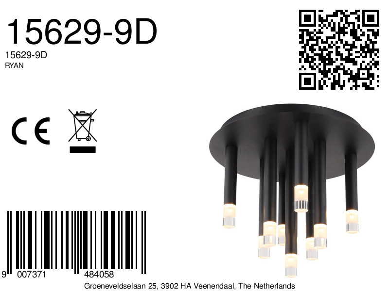 La lámpara de techo RYAN se distingue por su diseño moderno y elegante. Con una carcasa redonda de metal negro mate, esta lámpara añade un elemento estiloso a cualquier espacio. Las nueve delgadas pantallas cilíndricas, fabricadas en metal negro mate y acabadas con acrílico satinado y transparente, ofrecen una iluminación agradable y uniforme. Gracias a un diámetro de 340 mm, la RYAN es versátil y proporciona la solución de iluminación ideal para diferentes tamaños de habitaciones.