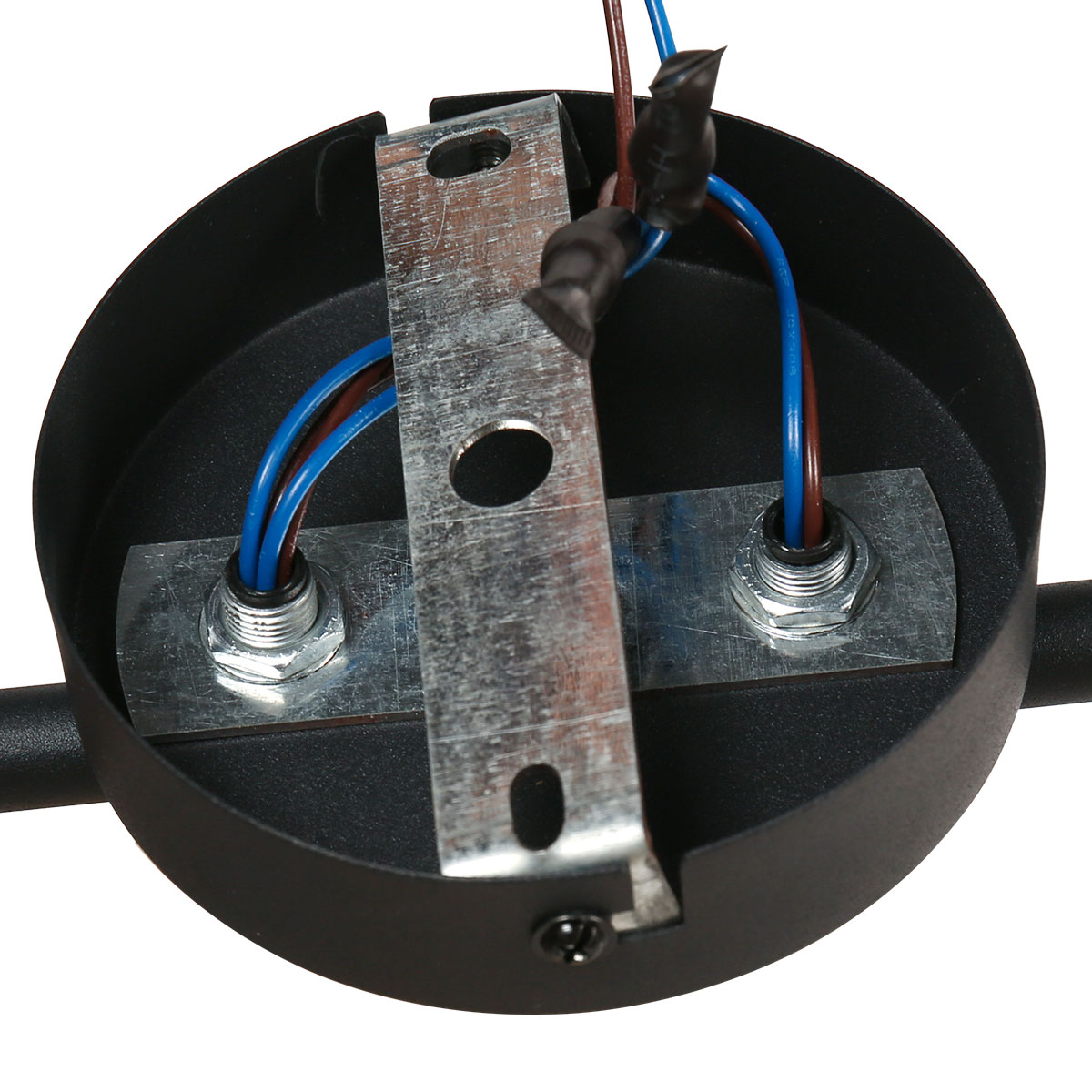 El ancho total de la lámpara es de aproximadamente 73 cm y la altura total es de unos 22 cm. La placa de techo redonda tiene un diámetro de 12 cm y una altura de aproximadamente 2,5 cm. Cada pantalla de vidrio tiene un diámetro de 12 cm y una altura de aproximadamente 11 cm. Los cuatro puntos de luz están fijados individualmente al soporte y ligeramente inclinados, lo que permite que la luz se distribuya de manera dirigida por el espacio.