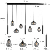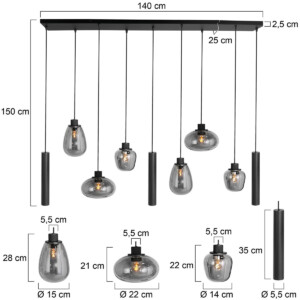 Lámpara colgante moderna de 9 luces de la serie Reflexion de Steinhauer, una mezcla elegante de 6 esferas de vidrio ahumado y 3 tubos, cada uno con un casquillo E27 o GU10. Los tubos proporcionan luz directa sobre la mesa, mientras que las esferas de vidrio distribuyen la luz de manera acogedora. Las esferas varían en tamaño y tienen un acabado sutilmente reflectante. Con un ancho de 140 cm y una profundidad de 44 cm, esta lámpara es una pieza de diseño llamativa. Los tubos están equipados con fuentes de luz regulables de 4,9 W, ajustables de 2200 a 2700 Kelvin. Incluye 2 años de garantía del fabricante.