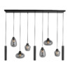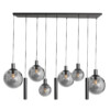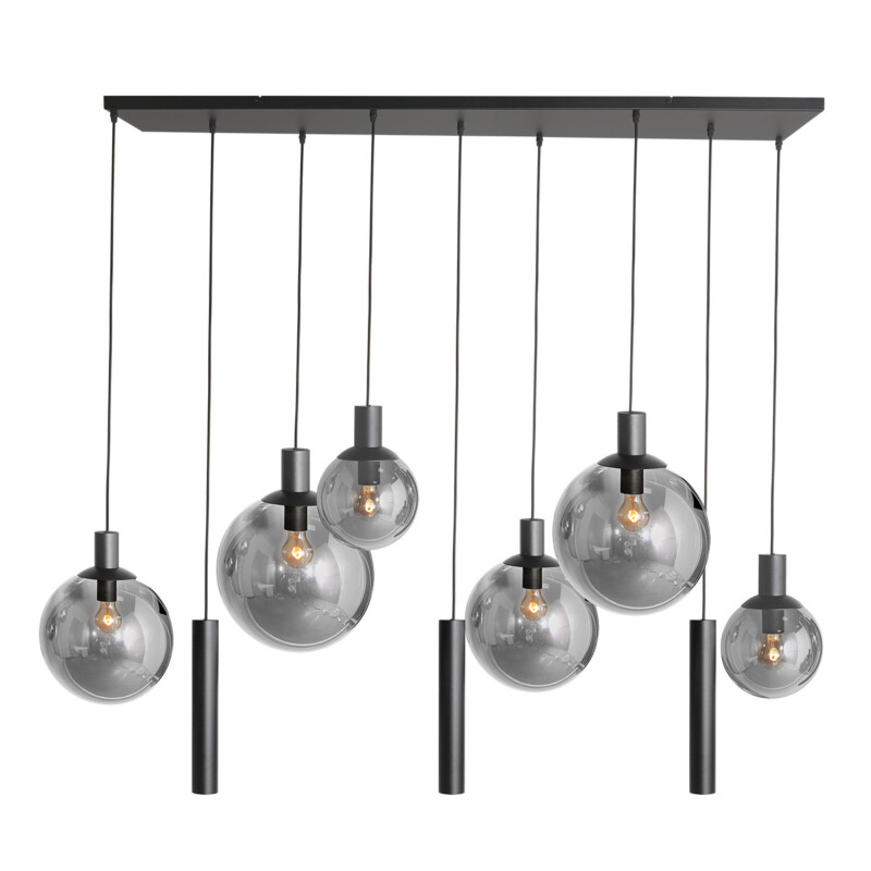 Diseño de lámpara colgante de 9 luces de la serie Bollique de Steinhauer, una combinación de 6 esferas de vidrio ahumado y 3 tubos para una distribución de luz equilibrada. Las esferas varían en tamaño (20, 25 y 30 cm) y ofrecen una apariencia juguetona y atmosférica. La lámpara tiene un ancho de 150 cm y una profundidad de 55 cm, con una altura ajustable entre 35 y 150 cm. Los tubos están equipados con fuentes de luz regulables de 4,9 W, que pueden ser ajustadas de 2200 a 2700 Kelvin. Incluye 2 años de garantía de fábrica.