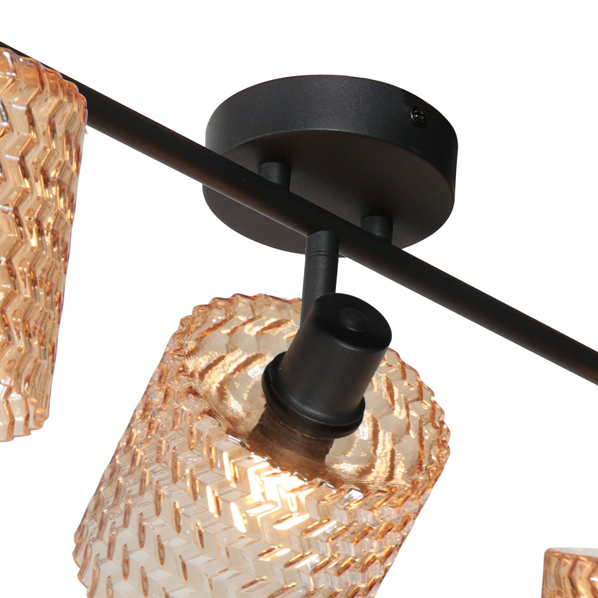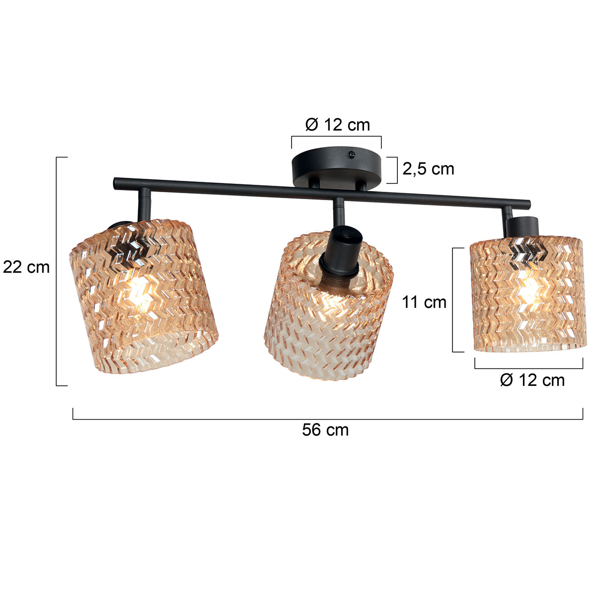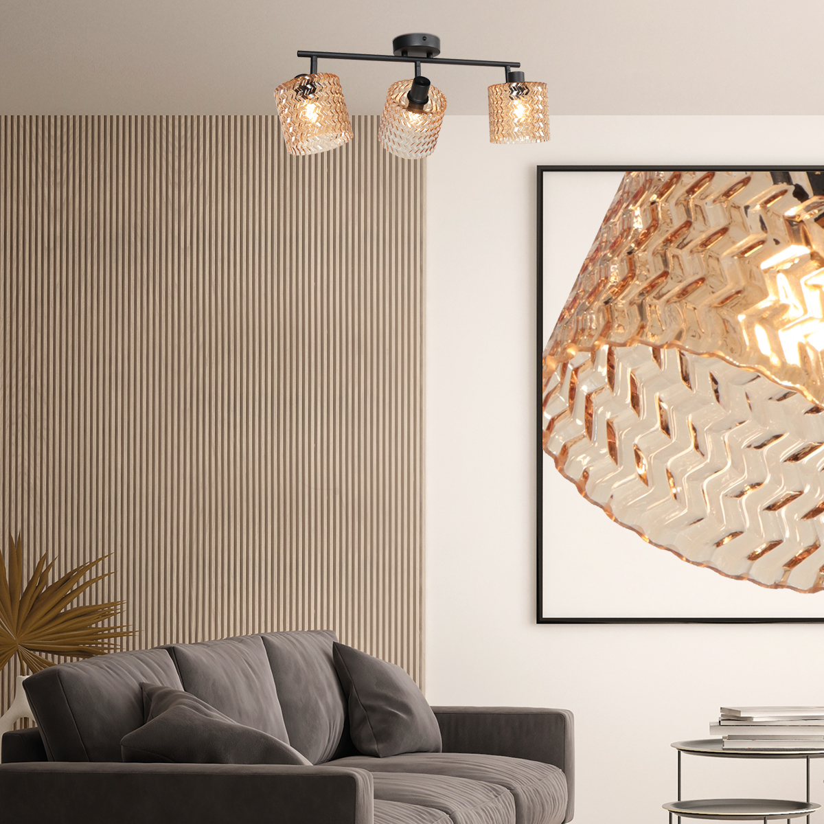 Esta lámpara de techo presenta un elegante marco negro y tres puntos de luz, cada uno equipado con una pantalla de vidrio ámbar con una textura en relieve. El patrón del vidrio crea un efecto de luz cálido y juguetón, mientras que el metal negro ofrece un contraste tranquilo y moderno. Gracias a la combinación de múltiples puntos de luz y vidrio decorativo, esta lámpara es adecuada como iluminación ambiental en, por ejemplo, la sala de estar, el pasillo o el dormitorio.