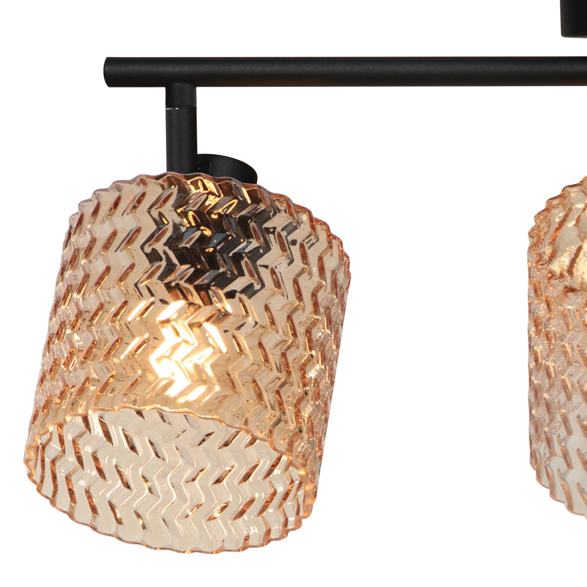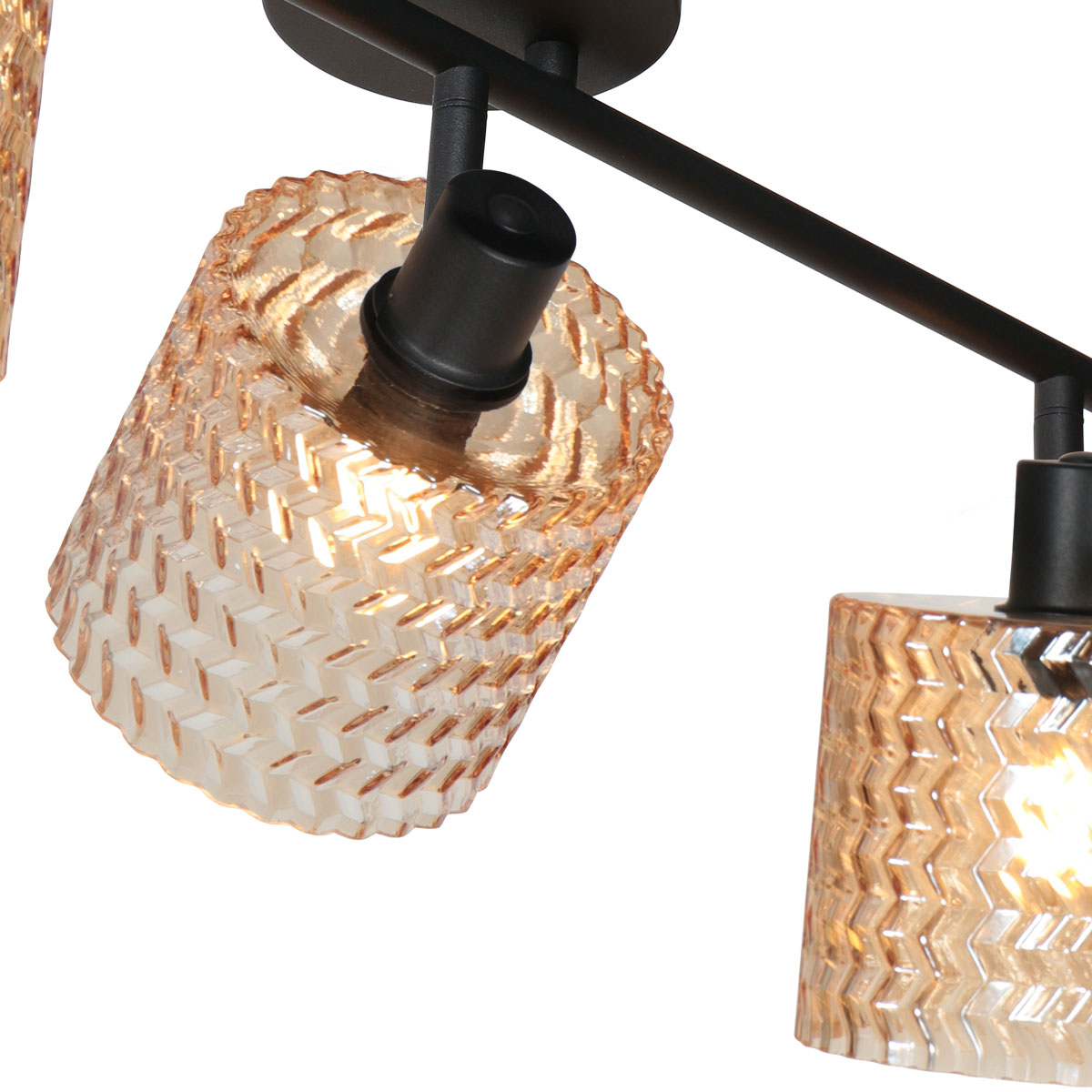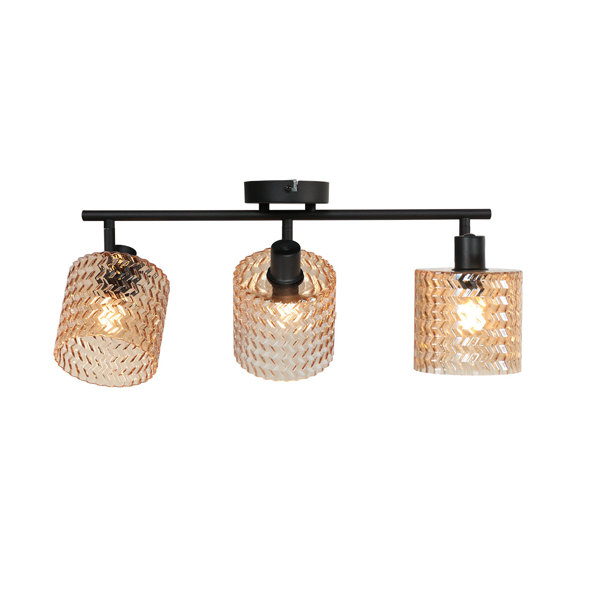 Esta lámpara de techo presenta un elegante marco negro y tres puntos de luz, cada uno equipado con una pantalla de vidrio ámbar con una textura en relieve. El patrón del vidrio crea un efecto de luz cálido y juguetón, mientras que el metal negro ofrece un contraste tranquilo y moderno. Gracias a la combinación de múltiples puntos de luz y vidrio decorativo, esta lámpara es adecuada como iluminación ambiental en, por ejemplo, la sala de estar, el pasillo o el dormitorio.