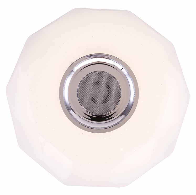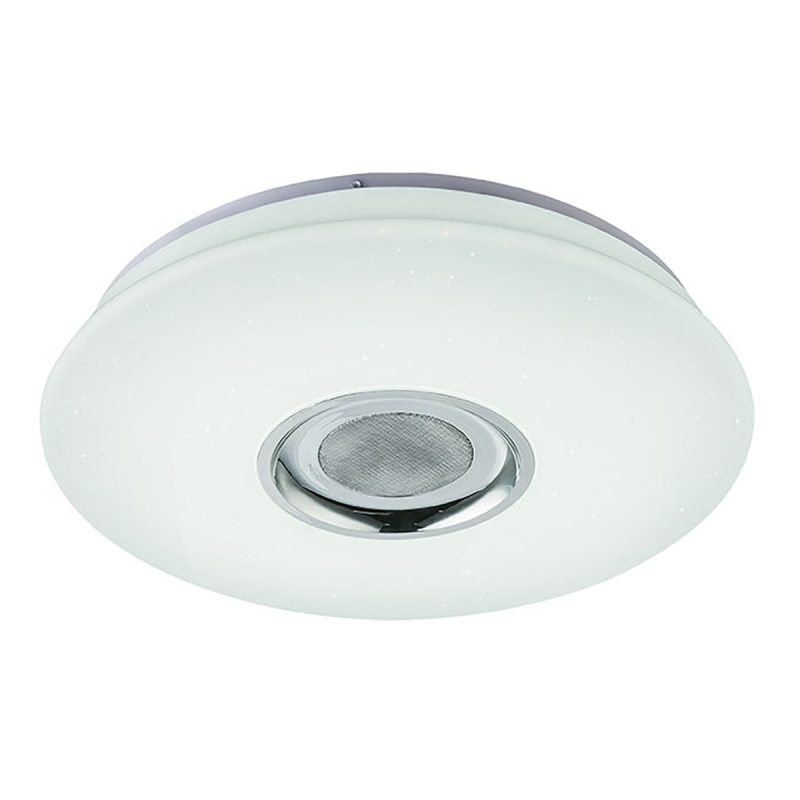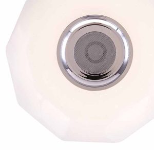 La lámpara de techo Nicole, con un diámetro de 40cm, se destaca por su versatilidad. Esta fuente de luz está compuesta de opal y plástico blanco, lo que le da un aspecto perlado, y está equipada con un potente altavoz de 5W. La lámpara se puede conectar fácilmente a sus dispositivos a través de Bluetooth para transmitir su música favorita. Elija la iluminación ambiental según su estado de ánimo con el control remoto incluido, alternando entre tres configuraciones de luz únicas (blanco cálido 3000K, blanco neutro 4000K, hasta blanco frío 6000K) o cambie a efectos de luz roja, verde o azul con esta lámpara regulable, que puede proporcionar hasta 1440 lúmenes.