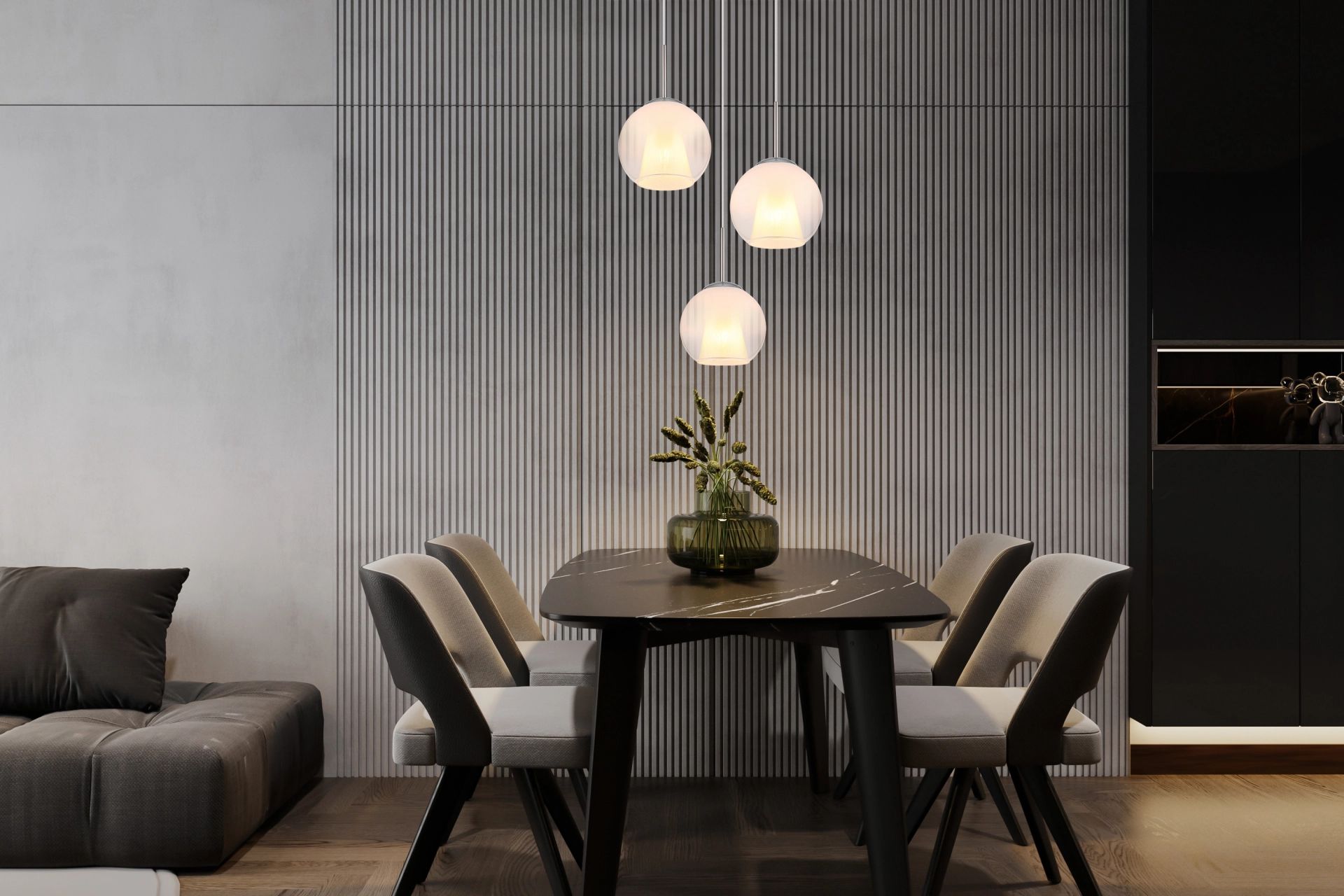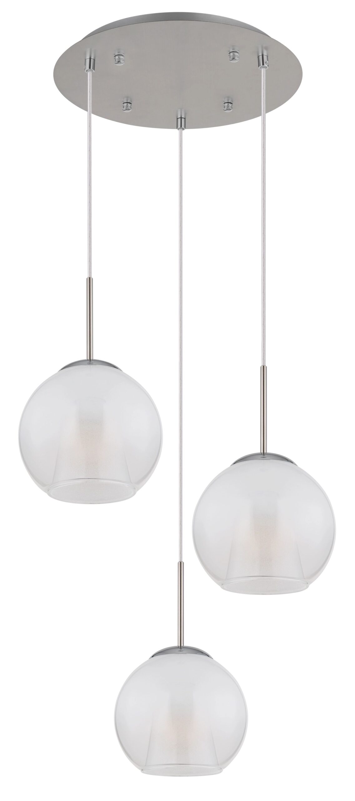 La lámpara colgante redonda BARRY, equipada con tres esferas de vidrio, es un complemento refinado para cualquier interior. El cuerpo de la lámpara, hecho de níquel mate y metal cromado, ofrece un aspecto contemporáneo. Las esferas de vidrio en opal y claro con un diseño en degradado crean hermosas reflexiones de luz. Con un diámetro de 450 mm, esta lámpara es ideal para colgar sobre mesas de comedor o en amplios salones.
