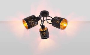La lámpara de techo TUNNO, con su pantalla de textil negra y dorada y sus punciones decorativas, ilumina maravillosamente cualquier habitación con sus tres casquillos E14 que le permiten ajustar la intensidad y el color de la luz según su preferencia.