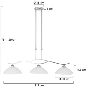 La lámpara colgante de 3 luces en color acero de la serie Capri de Steinhauer ofrece una combinación equilibrada de diseño moderno y clásico. Los tubos metálicos rectos le otorgan a la lámpara un aspecto contemporáneo, mientras que las pantallas de vidrio elegantes crean un efecto de luz cálido. Equipado con tres portalámparas E27, adecuado para fuentes de luz de hasta 40 vatios, esta lámpara proporciona una iluminación agradable y uniforme. La altura es ajustable entre 78 y 125 cm, y con un ancho de 115 cm, esta lámpara es ideal para sobre una mesa de comedor o en una amplia sala de estar.