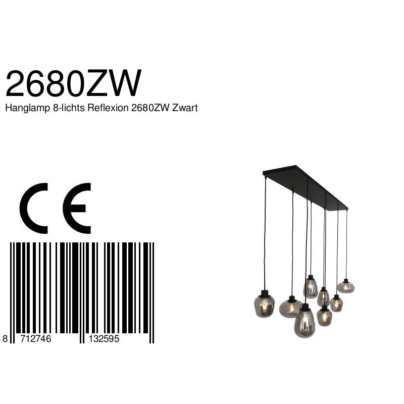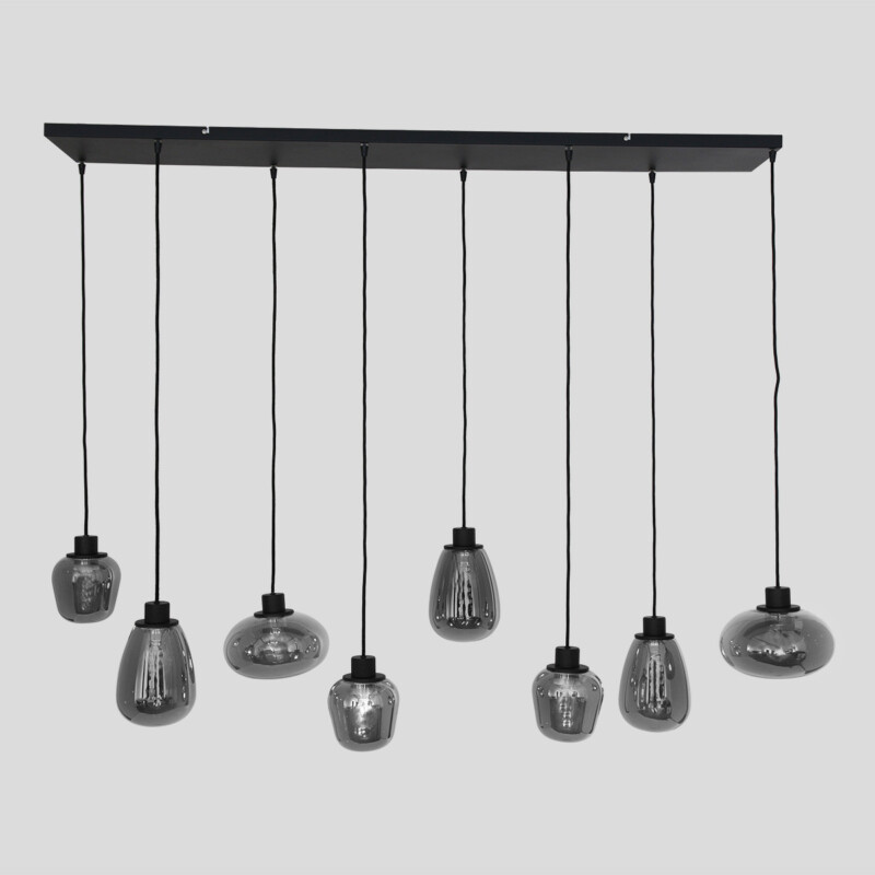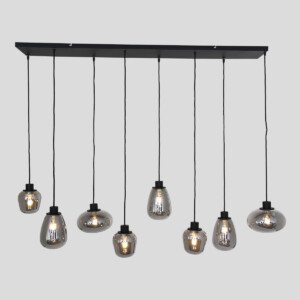 La lámpara colgante de 8 luces de la serie Reflexion tiene una placa de techo rectangular con una longitud de 145 cm. Las esferas de luz de vidrio ahumado cuelgan a diferentes alturas y se pueden ajustar individualmente durante la instalación hasta un máximo de 160 cm. Equipado con ocho casquillos E27, adecuado para fuentes de luz de hasta 40 vatios (no incluido). Regulable con un regulador externo.