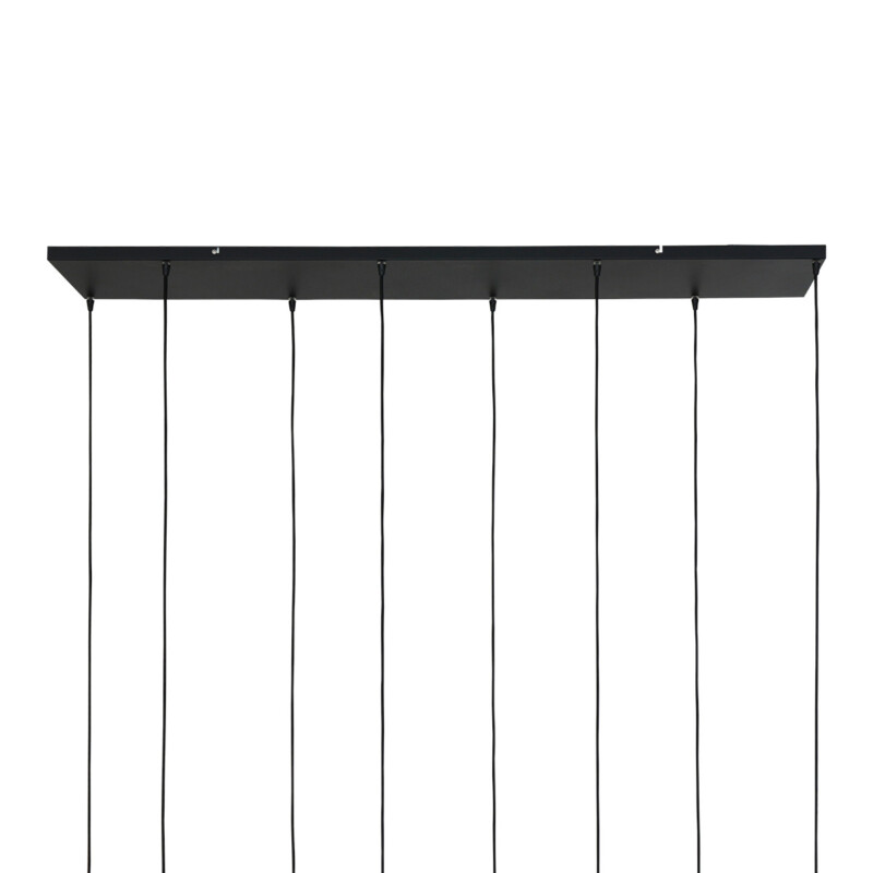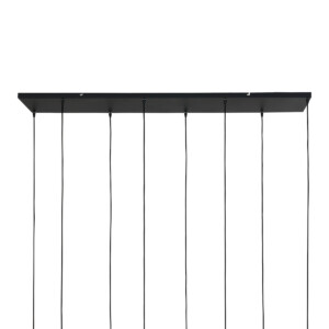 Esta lámpara colgante rectangular de metal negro de Reflexion definitivamente tiene un factor sorpresa. Siete bombillas de vidrio ahumado cuelgan juntas en diversas formas y tamaños. ¡Capturan tu mirada con su deslumbrante luz reflectante! Cuelgan juguetonamente a distintas alturas con cuerdas elegantes. La placa de techo rectangular de metal negro se mantiene simple. Reflexion da un impulso inmediato a una mesa de comedor larga o una isla de cocina.